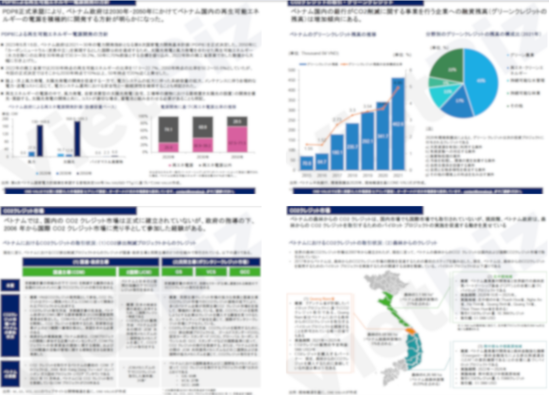ベトナムにおける再エネ・PDP8及びCO2クレジットについての動向が網羅的に把握できる調査レポートです。
