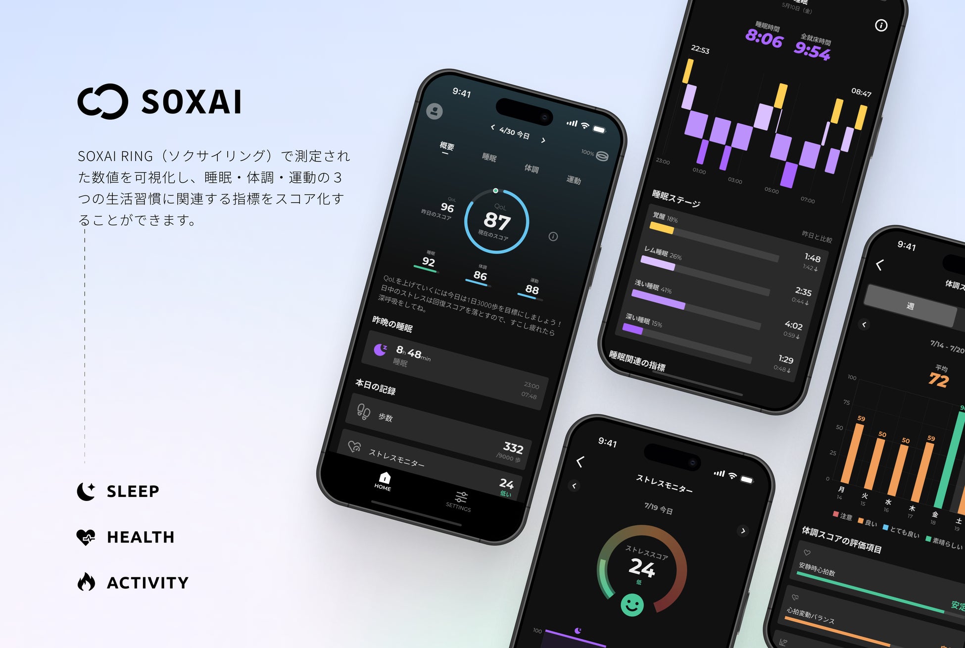 SOXAI RINGは健康データを正確に取得・分析可能な健康管理用スマートリングです。光学バイタルセンサー、温度センサー、加速度センサー、BLE通信機能、NFCワイヤレス充電機能など、最先端の技術が搭載されています。利用者はリングを着けるだけで様々な健康状態を分析でき、睡眠・体調・運動の3つのスコアから、生活の質(QoL)がスコア化されるとともに、AIがスコアに応じてパーソナライズされた生活習慣改善のアドバイスを身近なコンディショントレーナーとして、生成・提示し、健康増進や健康維持をサポートします。