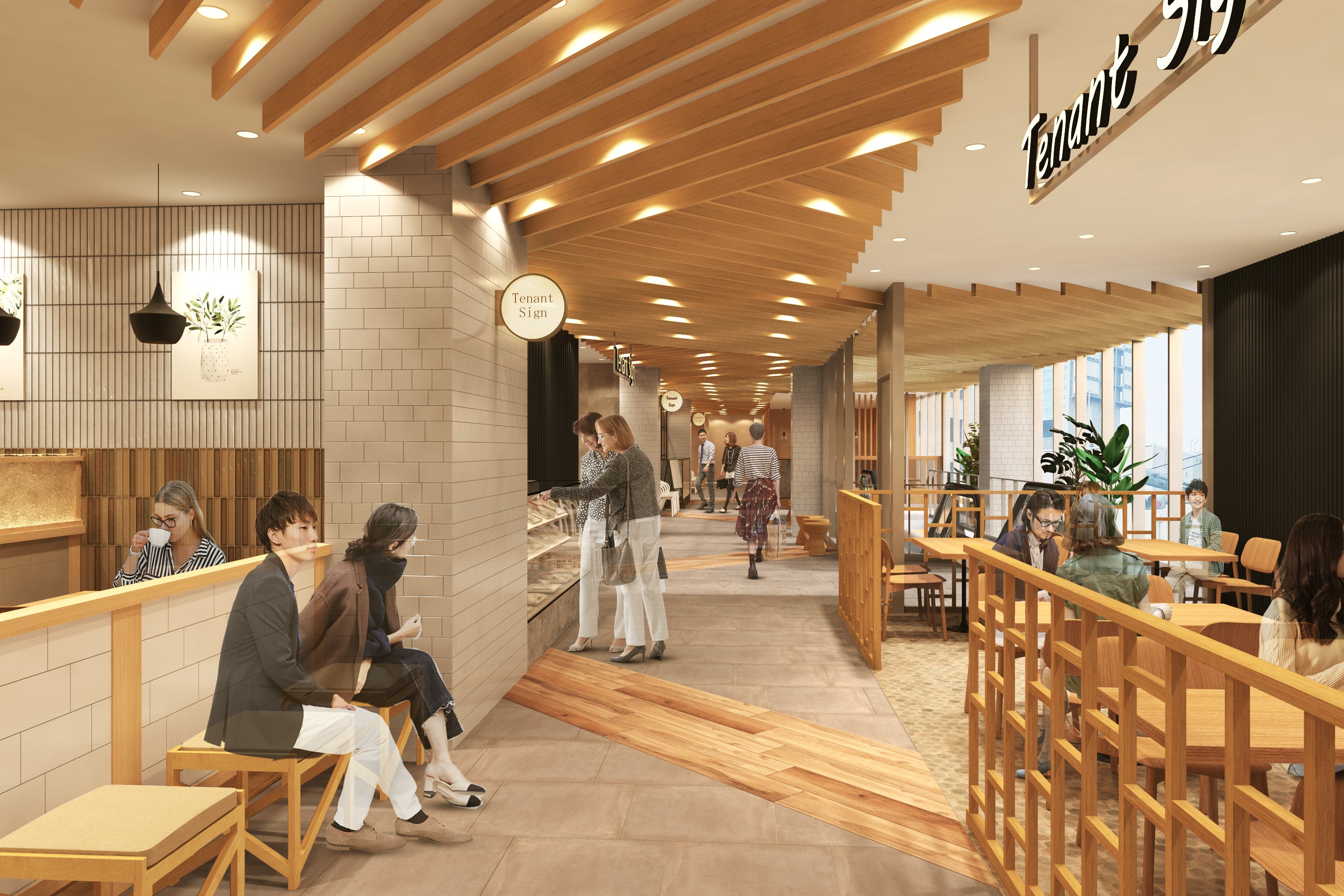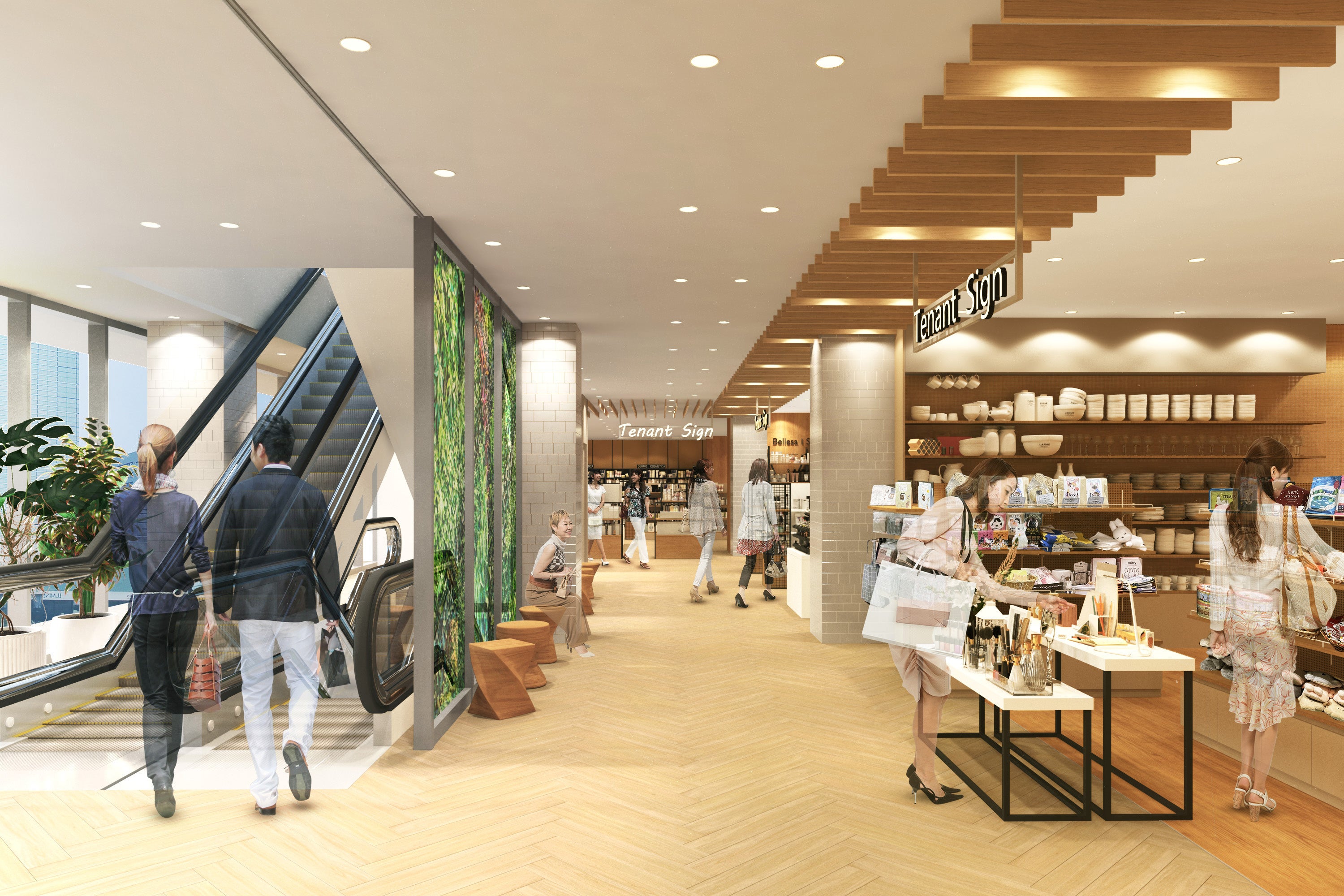 施設中央部にエスカレーターを設置し、各フロアに降り立つたびに全店舗の「顔」が見える動線計画になっています。店舗の「顔」となるファサードには個性が際立つデザインを取り入れ、各フロアを歩いて巡る楽しさを感じられるようにしていきます。