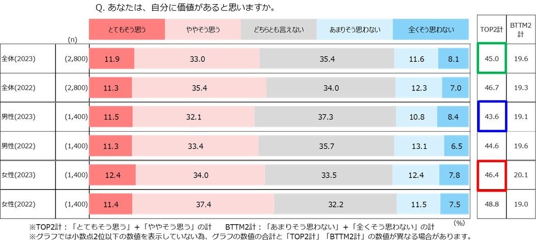 自己肯定感(自分に価値があると思うか)については、「とてもそう思う」「ややそう思う」と回答した割合は計45.0%で、前回より1.7pt低下。男女別では、前回調査同様、女性(46.4%)が男性(43.6%)を上回ったものの、女性▲2.4pt低下、男性▲1.0pt低下と、女性の方が下落幅がやや大きい結果となった