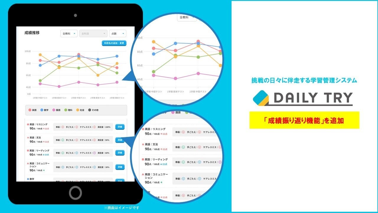 この度、学習管理システム(LMS)「DAILY TRY」に新たに「成績振り返り機能」が追加されました。本機能では、科目別のテスト結果だけでなく以下4つの項目も記録し、あらゆる角度から細かく振り返りを行います。