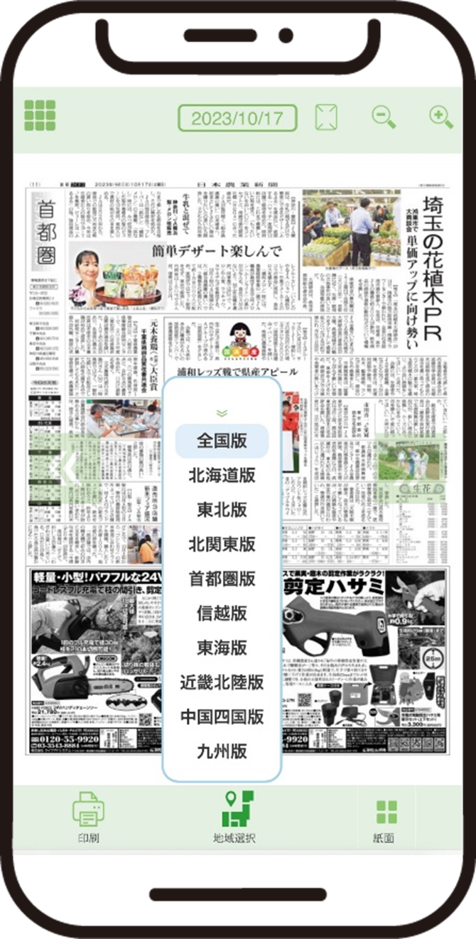地方版は、日本農業新聞読者モニター調査で「よく読む紙面」7年連続1位に選ばれた人気紙面。本紙記者やJA通信員が取材した年間約4万本にもなる、地域に密着した農業話題やJAの取り組みの記事を読むことができます。紙面ビューアーは、日本農業新聞の紙面をそのままパソコンやスマートフォンでご覧いただける電子版の機能の一つ。新たに設けた「地域選択」ボタンを押すと、ご自身の購読地域の地方版だけでなく、全9地域の地方版を閲覧できます。