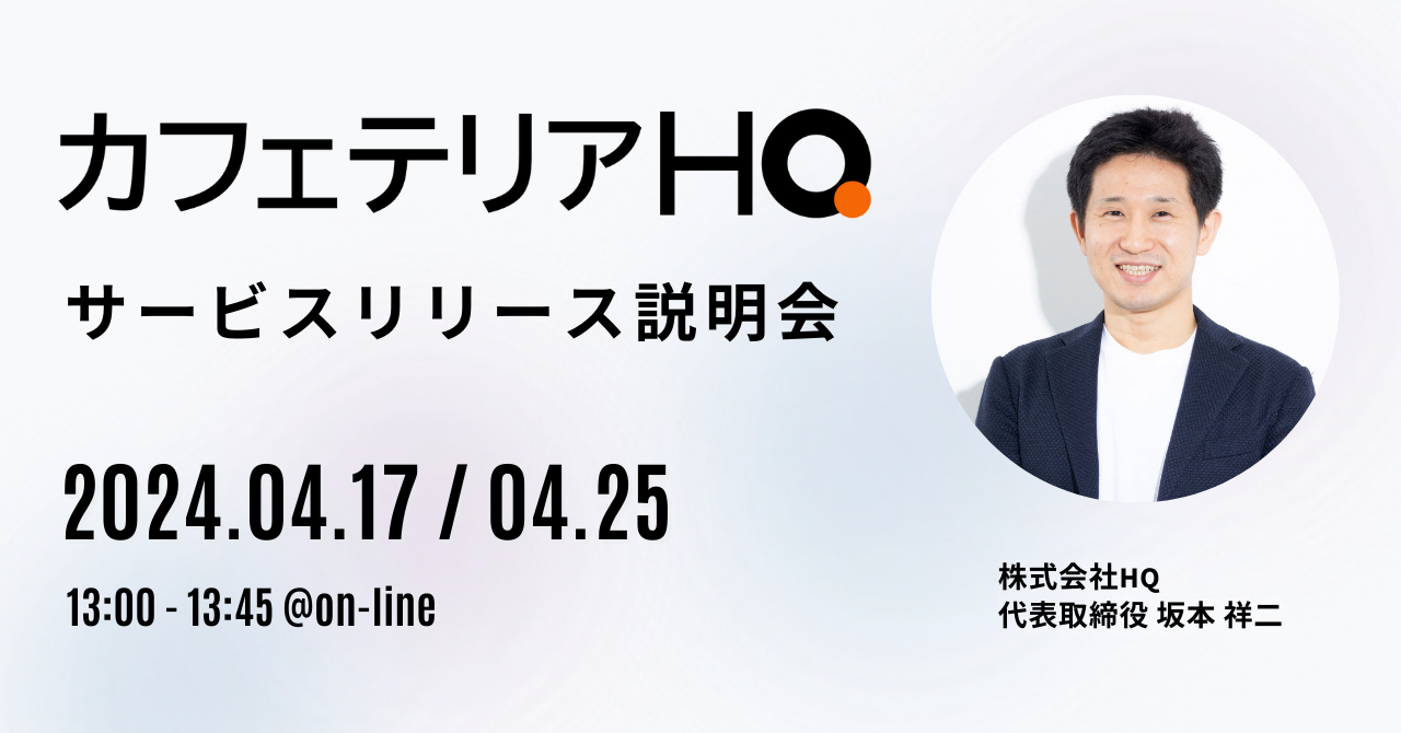 さらに、本サービスを解説する「カフェテリアHQ」オンライン説明会を4月17日(水)・25日(木)の13時より開催します。