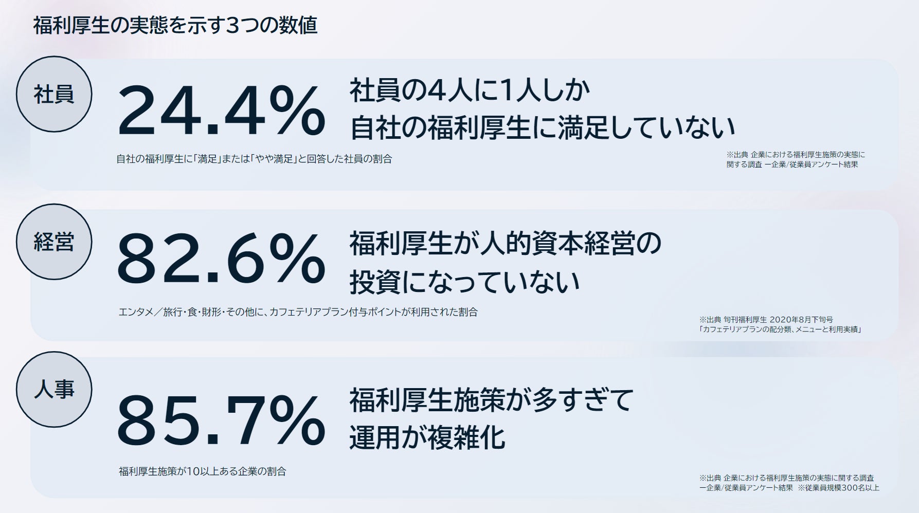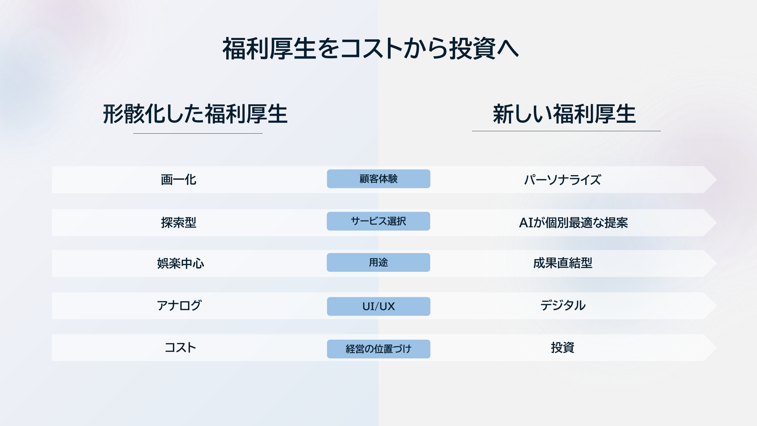 「AI活用の個別最適なサポート」「ワンストップサービスの提供」「投資対効果の最大化」などを通じて、形骸化した既存の福利厚生業界に一石を投じ、「福利厚生をコストから投資」へと変革します。