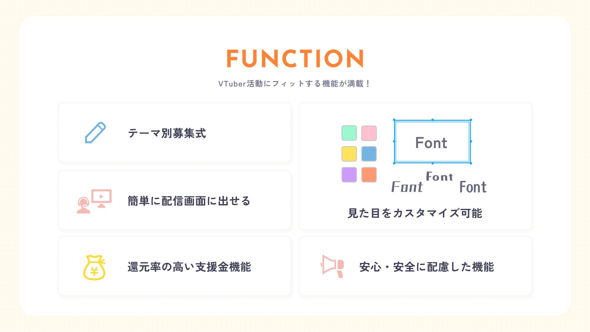 支援金を添えたおたよりを送ることで、VTuberへの応援がよりダイレクトに伝わり、視聴者とVTuberとの絆が一層深まります。手数料も20%に抑え、VTuberへの還元率が高いことが特徴です。
