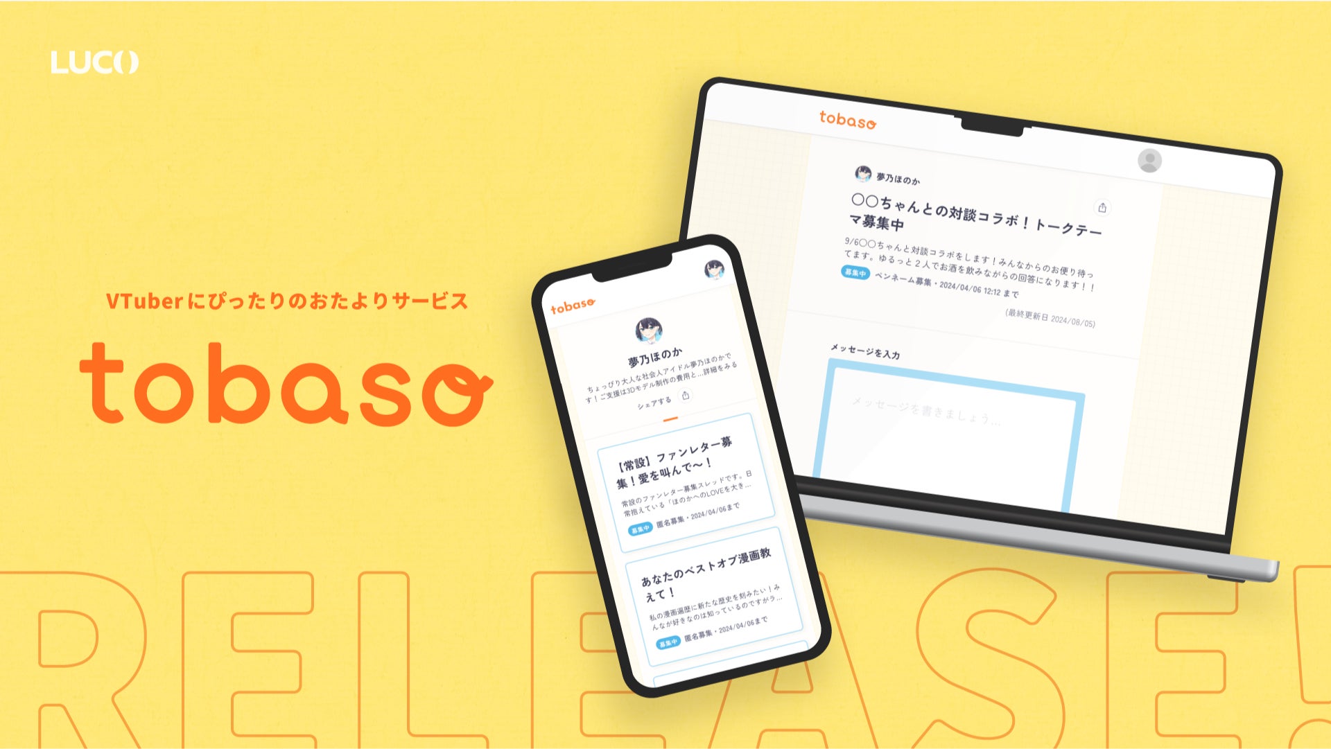 株式会社luco(本社:東京都渋谷区、代表取締役:呂文軒)は、 VTuber配信にぴったりのおたよりサービス『tobaso(とばそ)』の正式リリースをいたしました。
