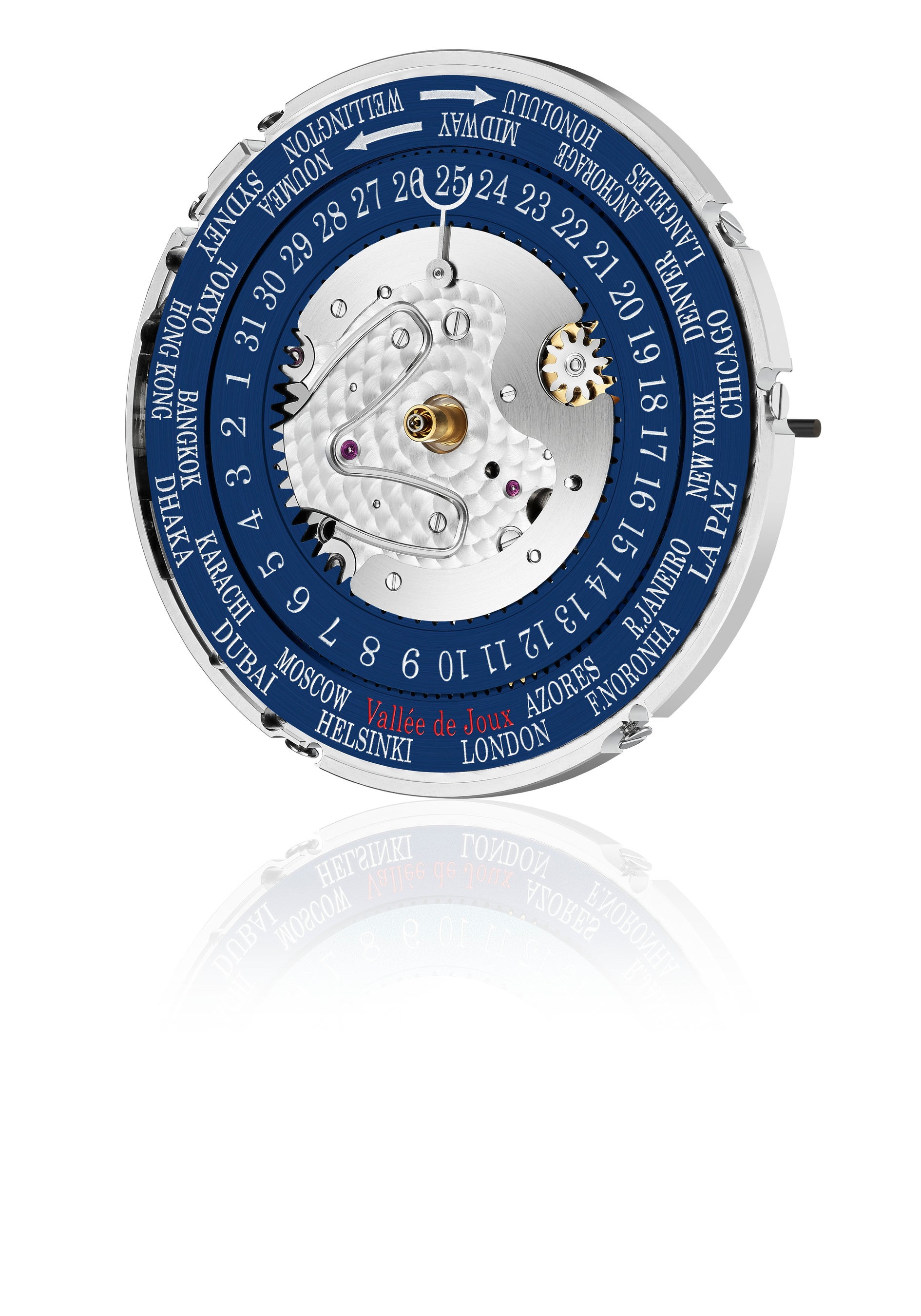 「マリーン オーラ・ムンディ 5555」が搭載するムーブメントは、キャリバー77F1です。このしっかりとした造りのムーブメントは、「オーラ・ムンディ」の誕生からコレクションを支えてきました(キャリバー77F0が2022年に77F1に進化)。77F1は、時刻と日付に加え、24のタイムゾーンに属す代表的な都市を選択することによって、それぞれに対応した時刻と日付を表示します。