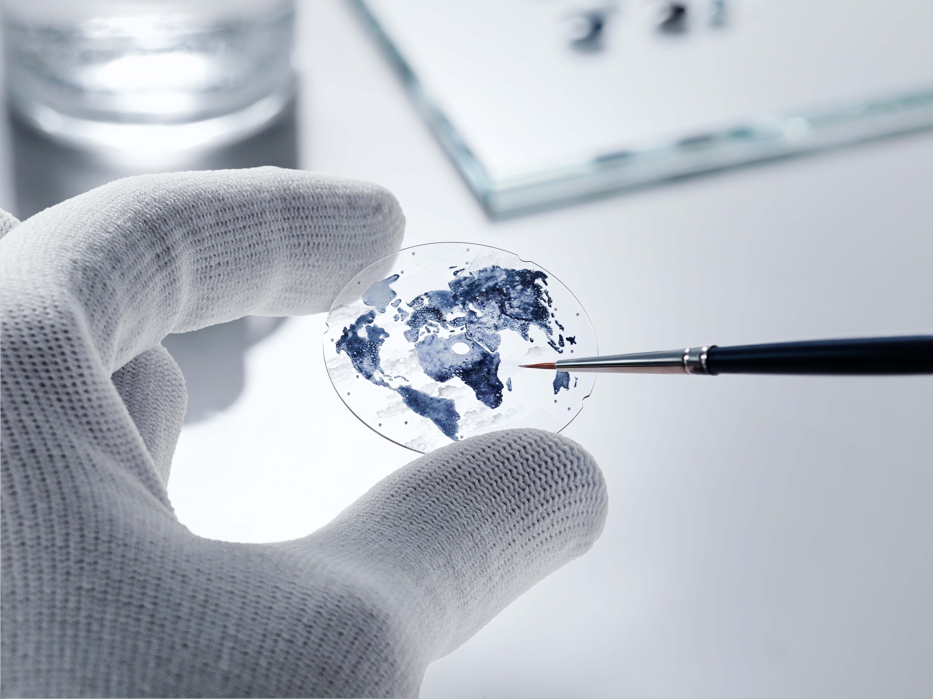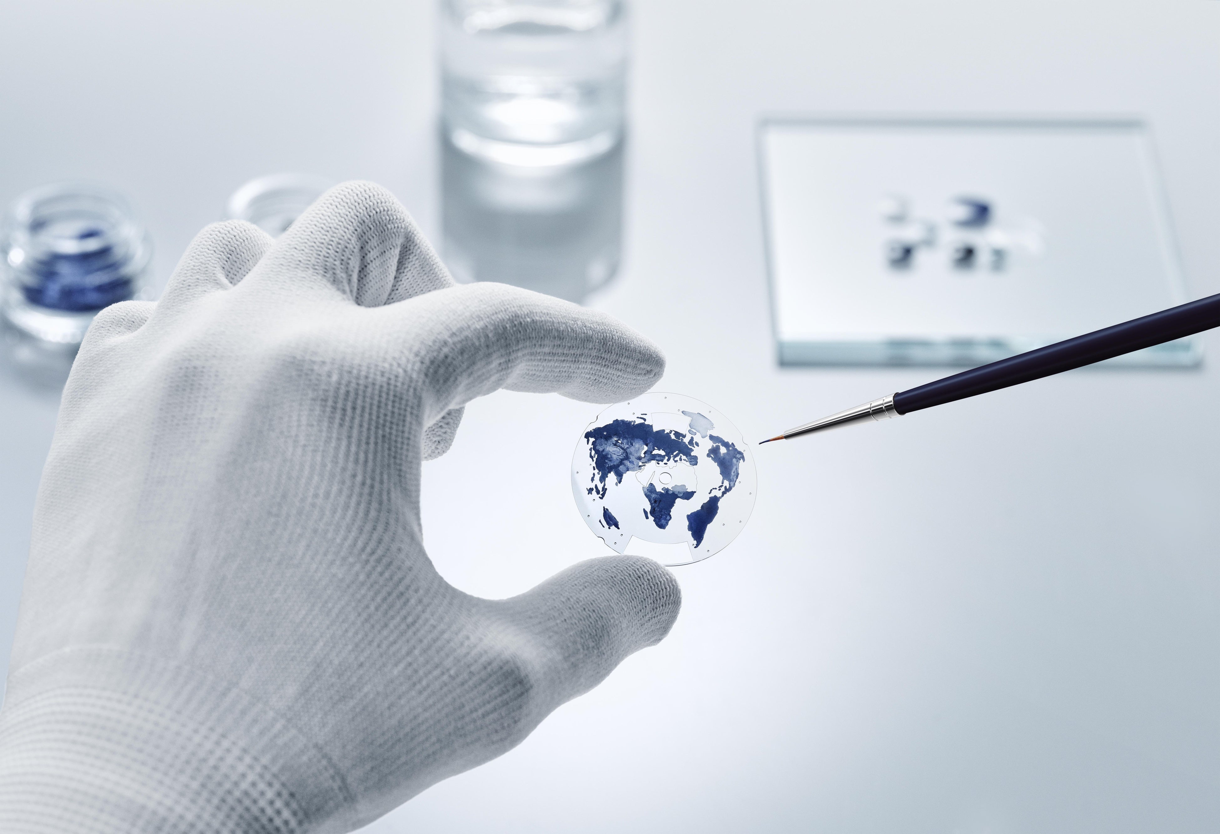 これらの大陸は、サファイアクリスタルの裏面に描かれています。その作業は極めて繊細です。というのは、ブレゲの職人は、サファイアクリスタルの表側で大陸が正しい位置にくるように、モチーフを鏡像で描かなくてはならないからです。これがグランフー・エナメルと名付けられた高温焼成の技法で仕上げられる第1段階のエナメル画になります。