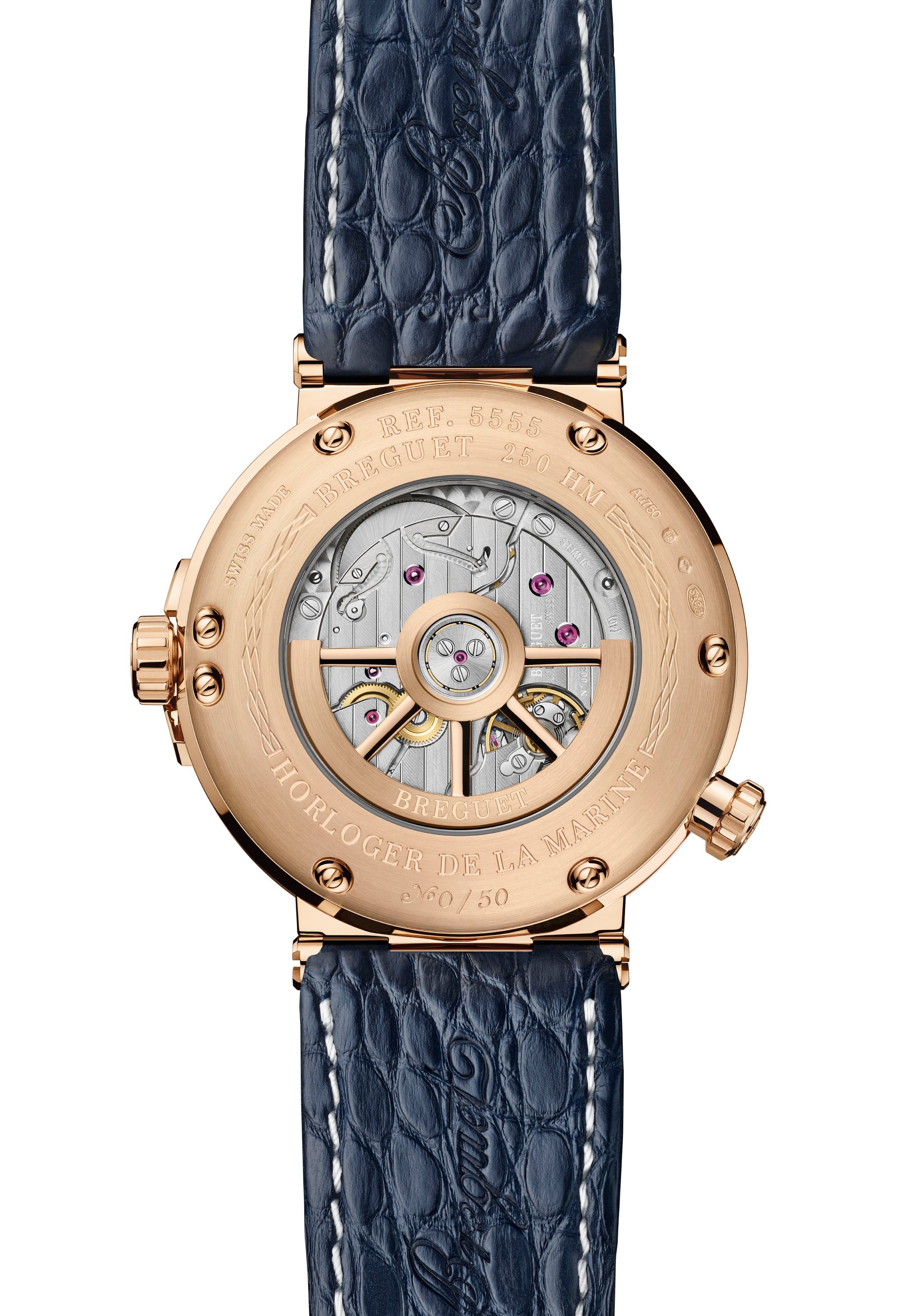 ケースバック側では、250周年を記念する特別なギヨシェ彫り模様「ケ・ド・ロルロージュ」による2本の縁飾りが目に入ります。サファイアクリスタルには他の250周年記念コレクションのモデルと同様に250周年記念ロゴが刻まれ、そこから見えるキャリバー77F1のローターにも初めてブレゲゴールドが用いられています。文字盤側では、50本限定の「マリーン オーラ・ムンディ 5555」を手に入れたオーナーの方々がディスクの都市名を好みに応じてアレンジできるようになっています。
