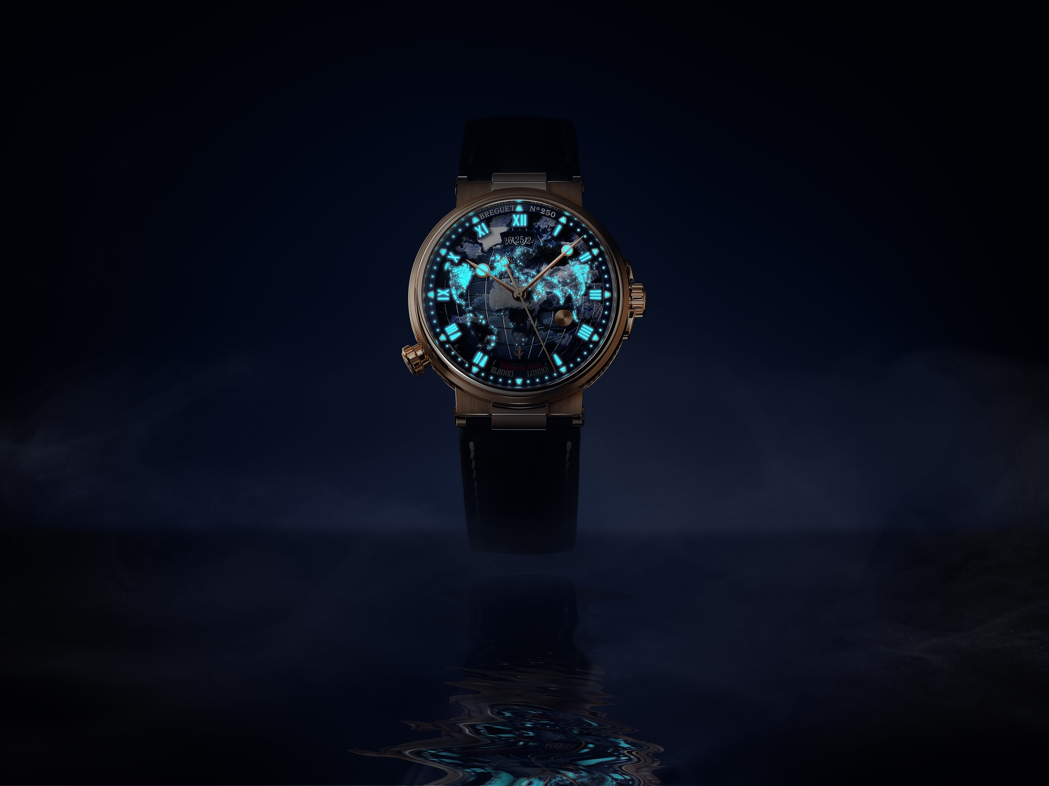 ブレゲゴールドを初めて採用するこの「マリーン オーラ・ムンディ 5555」は、ブレゲが特許出願中の新しい発光エナメルダイヤルを取り入れています。それぞれのオーナーは、24のタイムゾーンに好みの都市をパーソナライズすることができます。