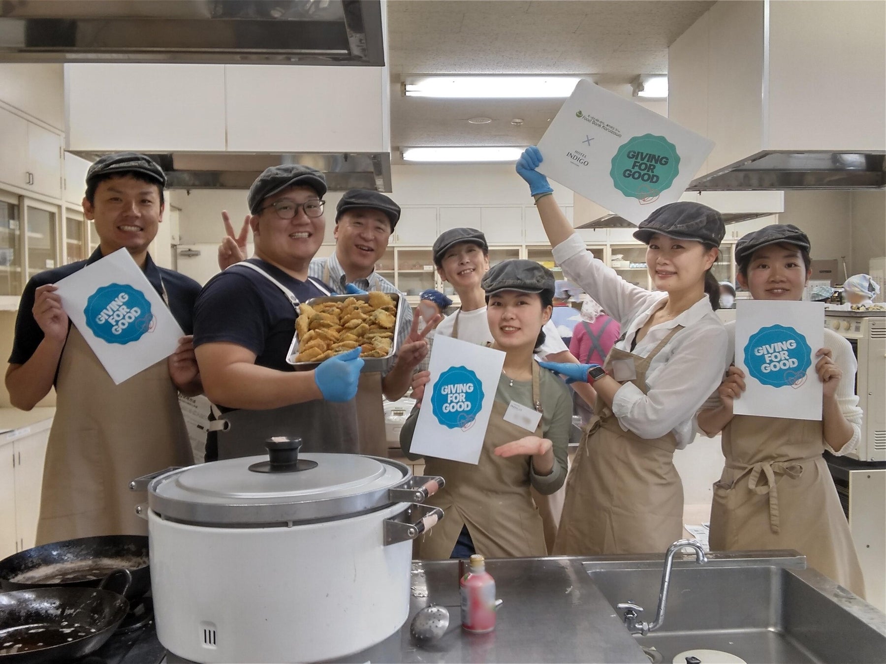 幼児からお年寄りまであらゆる世代の人が集まって食卓を囲む「こどものいばしょ・あたしキッチン」は、フードバンク軽井沢こどものいばしょ部会が主催する企画です。こどもの貧困イメージを前に出さないよう「こども食堂」の名前を使わず、自分の家のキッチンのように誰でも食事を楽しめる場にしたい、という主催者の想いからこの名がつきました。毎月1回(第4土曜)に開催され、集まったボランティアで毎回約120食を作ります。当ホテルでは毎月有志を募り、「こどものいばしょ・あたしキッチン」の食事作りのボランティアに参加しています。「Giving for Good month」である2024年9月も参加し、当日提供メニューの天ぷらや煮物作りをお手伝いしました。地元のボランティアの方々から郷土料理を教えていただく等、地域の方々との交流の場にもなっています。