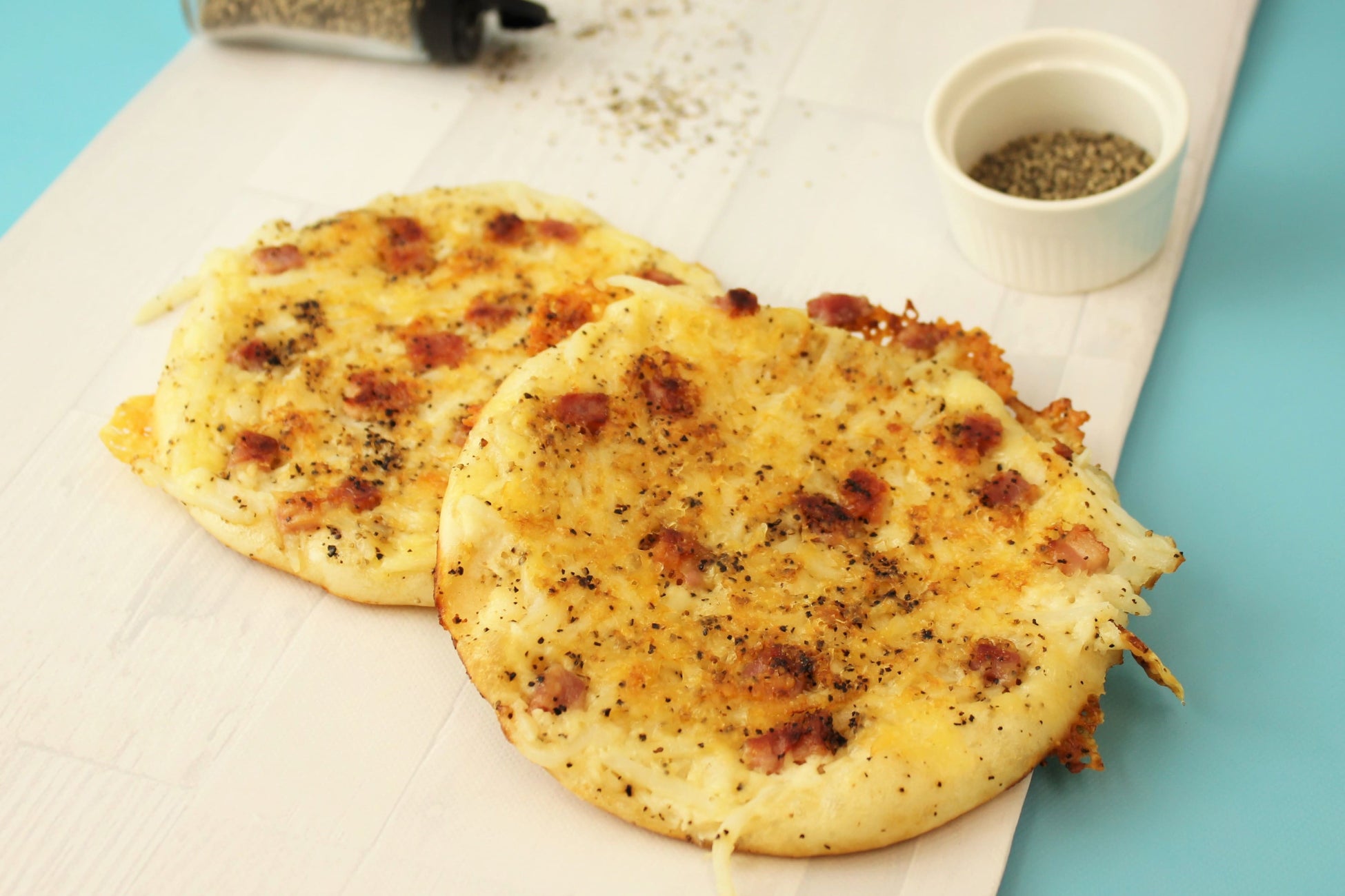 千切りポテトサラダ、ベーコン、チーズをのせて平たく焼き上げました。シャキシャキのポテトサラダとカリカリに焼かれたチーズの食感も楽しい一品。生地に塗った黒こしょうマヨネーズと、全体にしっかりときかせたブラックペッパーで、ピリッと引き締まった味わいに。
