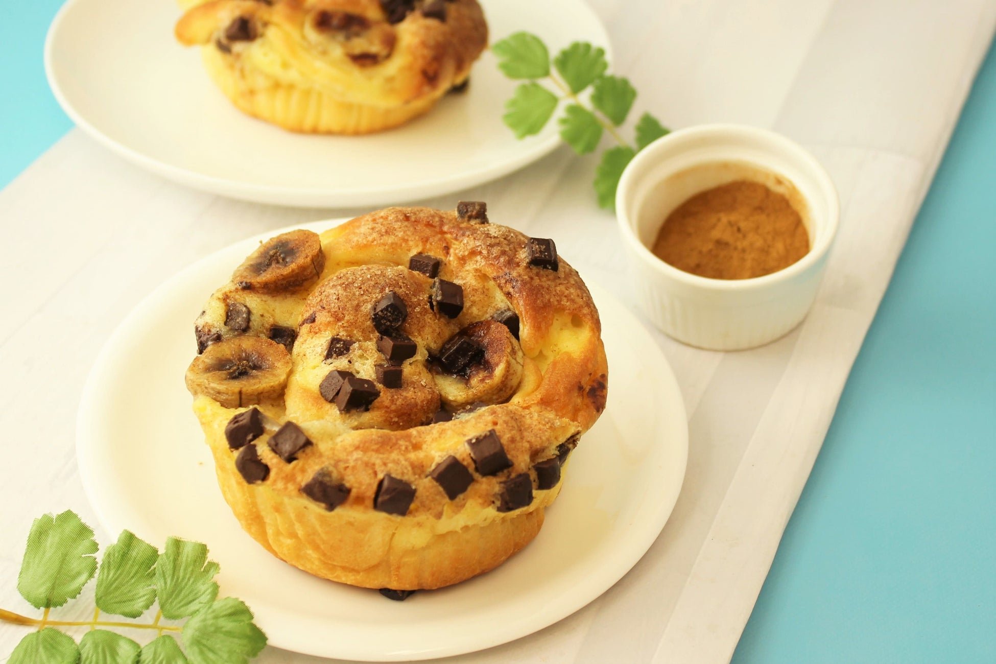 バナナペーストを包み、シナモンシュガーとバナナ、チャンクチョコをトッピングして焼き上げました。ふんわりと香るバナナの甘さと、大粒チョコの濃厚さと食感には、香り高いシナモンをかけ合わせるのが王道の美味しい組み合わせ。