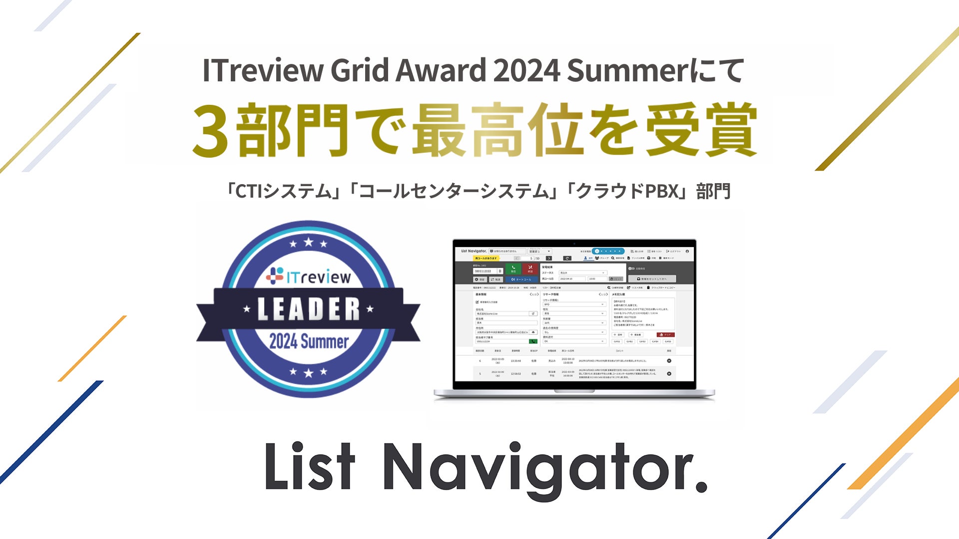 アウトバウンドコールシステム『List Navigator. 』が「ITreview Grid Award 2024 Summer」において3部門で最高位のLeaderを受賞