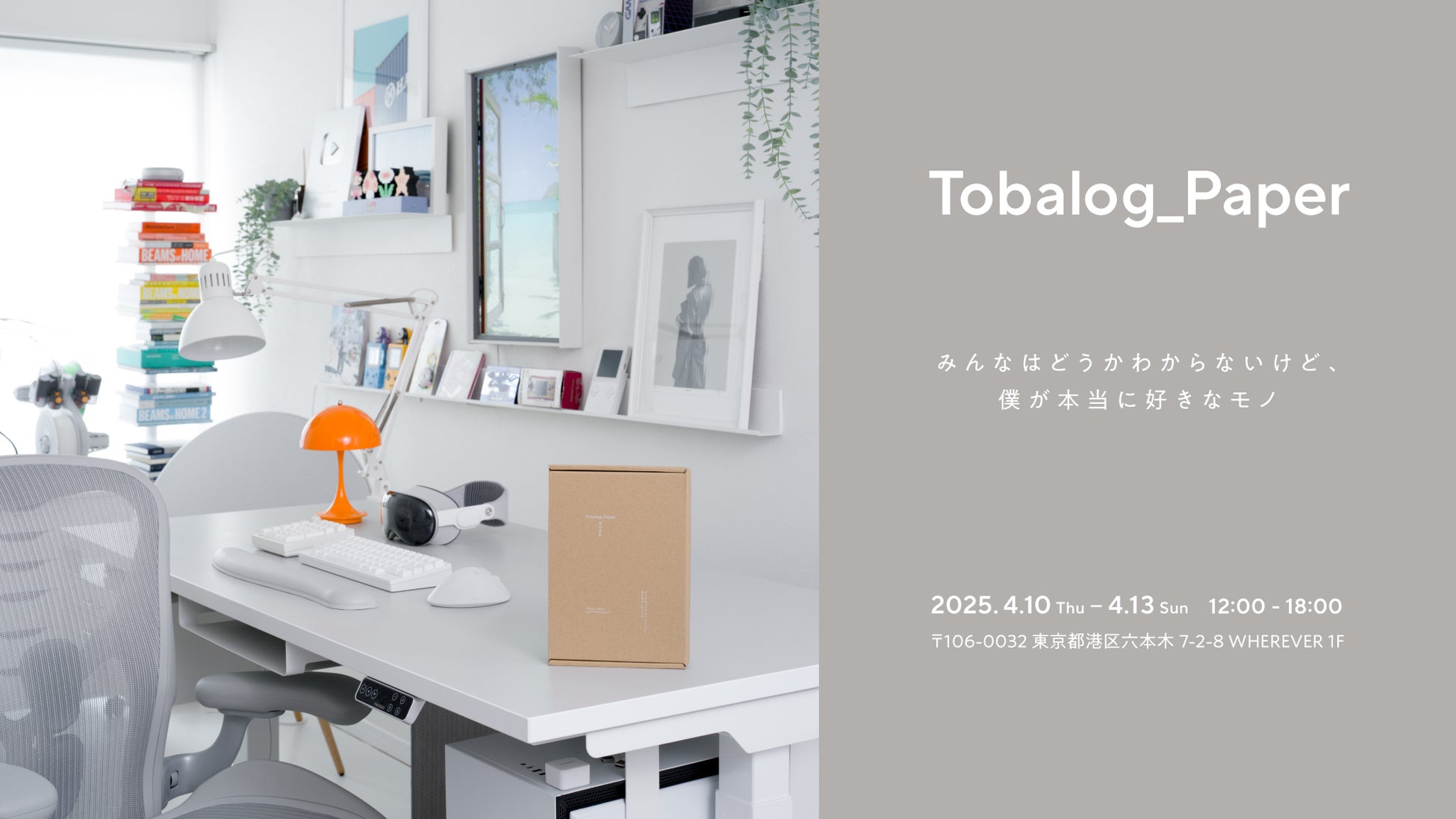 本展は、鳥羽さんのインディペンデントマガジン『Tobalog_Paper 〜みんなはどうかわからないけど、僕が本当に好きなモノ〜』の刊行を記念したもの。同書にまとめ上げられた、愛用品やワークスペースを展示するとともに、書籍の販売を行います。