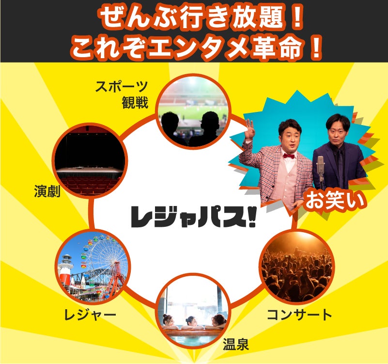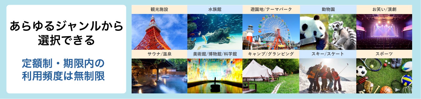 レジャパスは、遊園地・水族館・動物園・美術館・温泉・キャンプ場など全国165以上のさまざまなジャンルの有料施設を月額1,980円(税別)〜の会費のみで利用できる定額制サービスです。直近では、スポーツ観戦や観劇など幅広いジャンルに拡大しています。