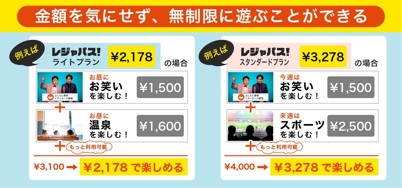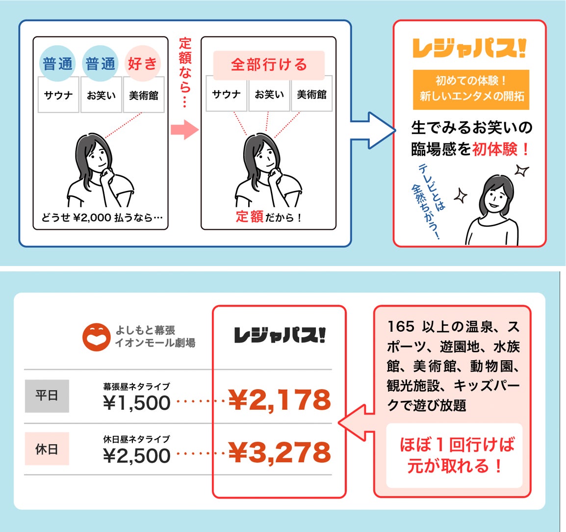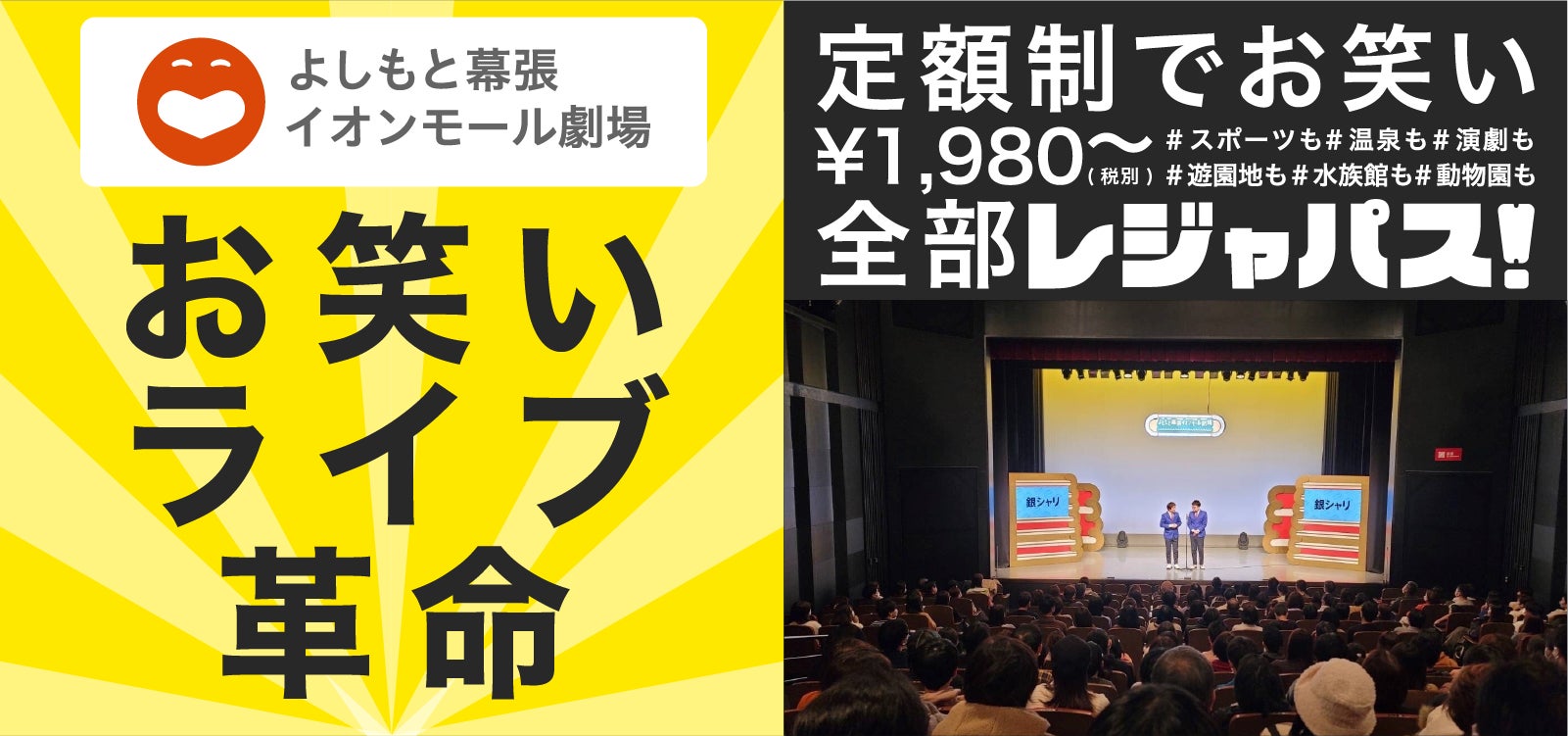 お笑いライブの取り扱いは今回が初めて。全国14の劇場を持つ吉本興業株式会社(本社:大阪市中央区、代表取締役社長:岡本昭彦)が運営する「よしもと幕張イオンモール劇場」での観覧がレジャパスの対象となります。