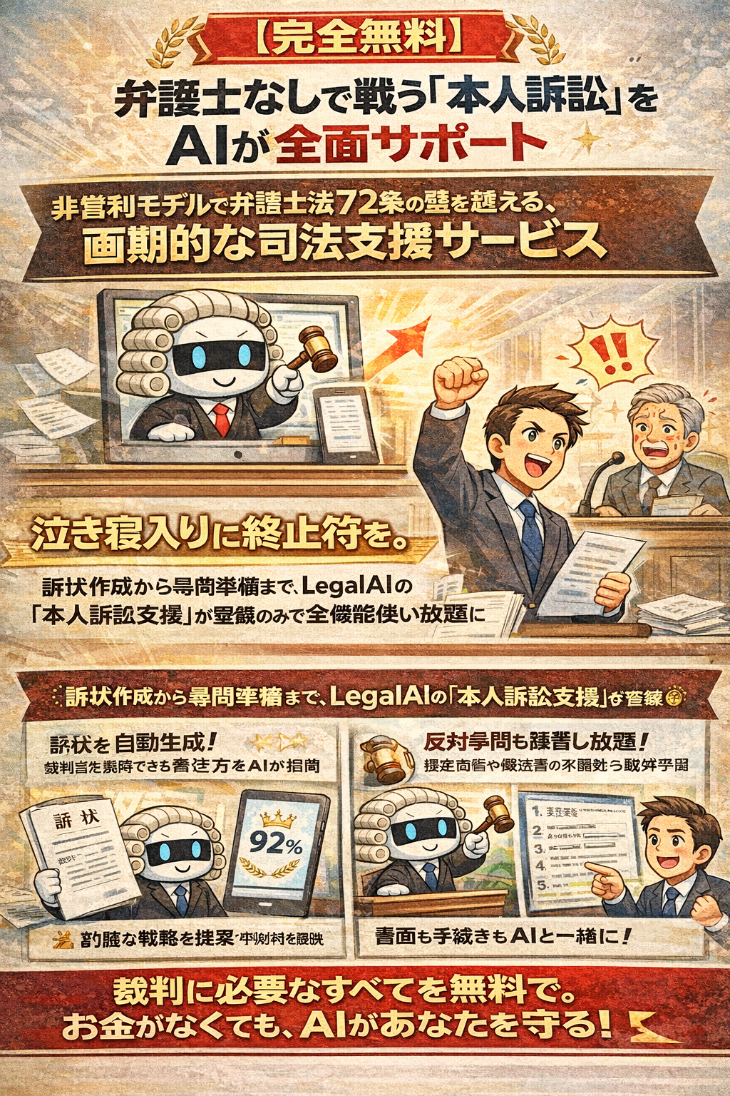 【完全無料】弁護士なしで戦う「本人訴訟」をLegal AIが全面サポート。非弁行為に当たらない弁護士法72条の壁を越える、国民の味方となり、司法支援サービス