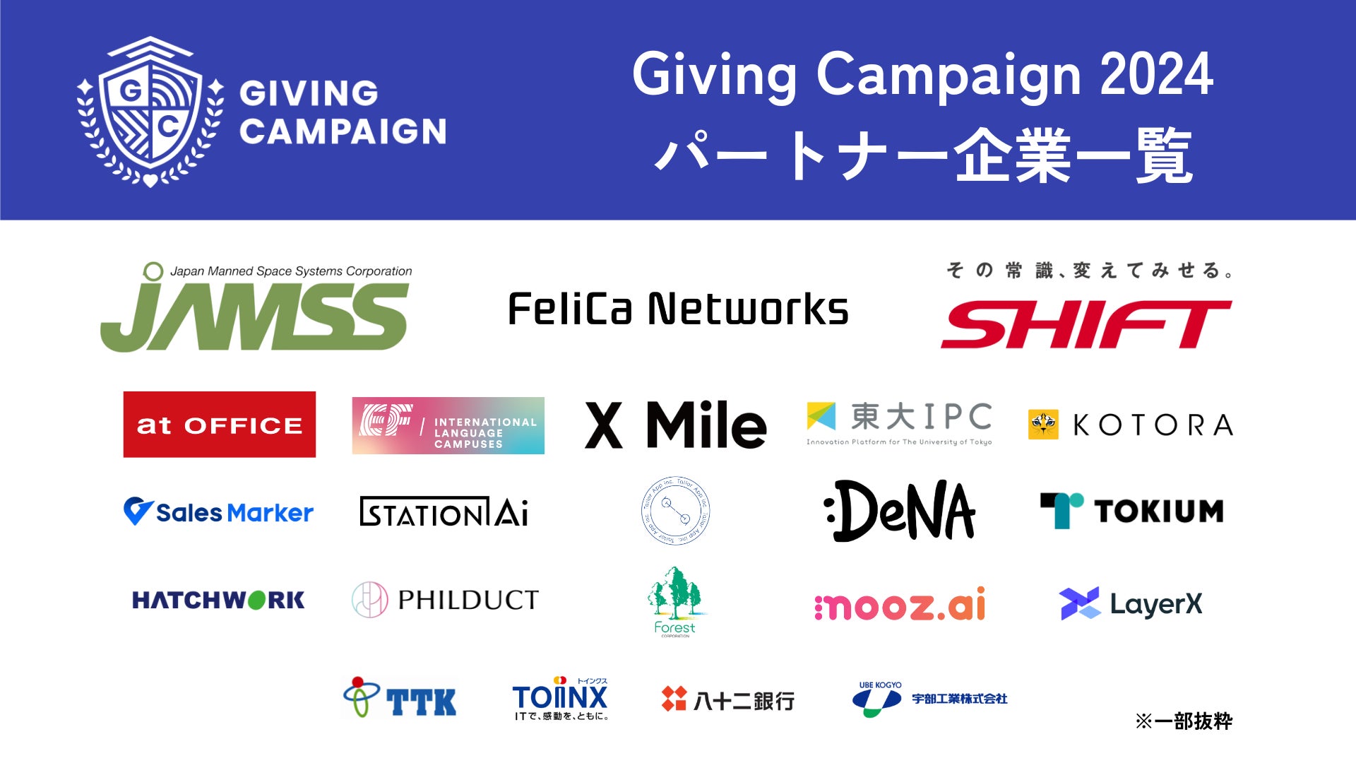 Giving Campaignにおける課外活動団体への支援金は、パートナー企業からの協賛金を原資としています。持続可能なGiving Campaignの開催に向けて、ご支援いただけるパートナー企業を募集しております。