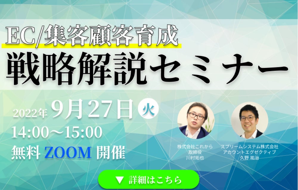 スプリームシステム株式会社(本社:東京都豊島区、代表取締役:佐久間 卓哉)は、2022年9月27日(火) 14時から株式会社これからと共同で「EC 集客/顧客育成~戦略解説セミナー~それぞれの成功事例解説します~」をテーマに、無料オンラインセミナーを開催いたします。お客様の新規獲得や育成にお悩みがある方は、是非ご参加ください。