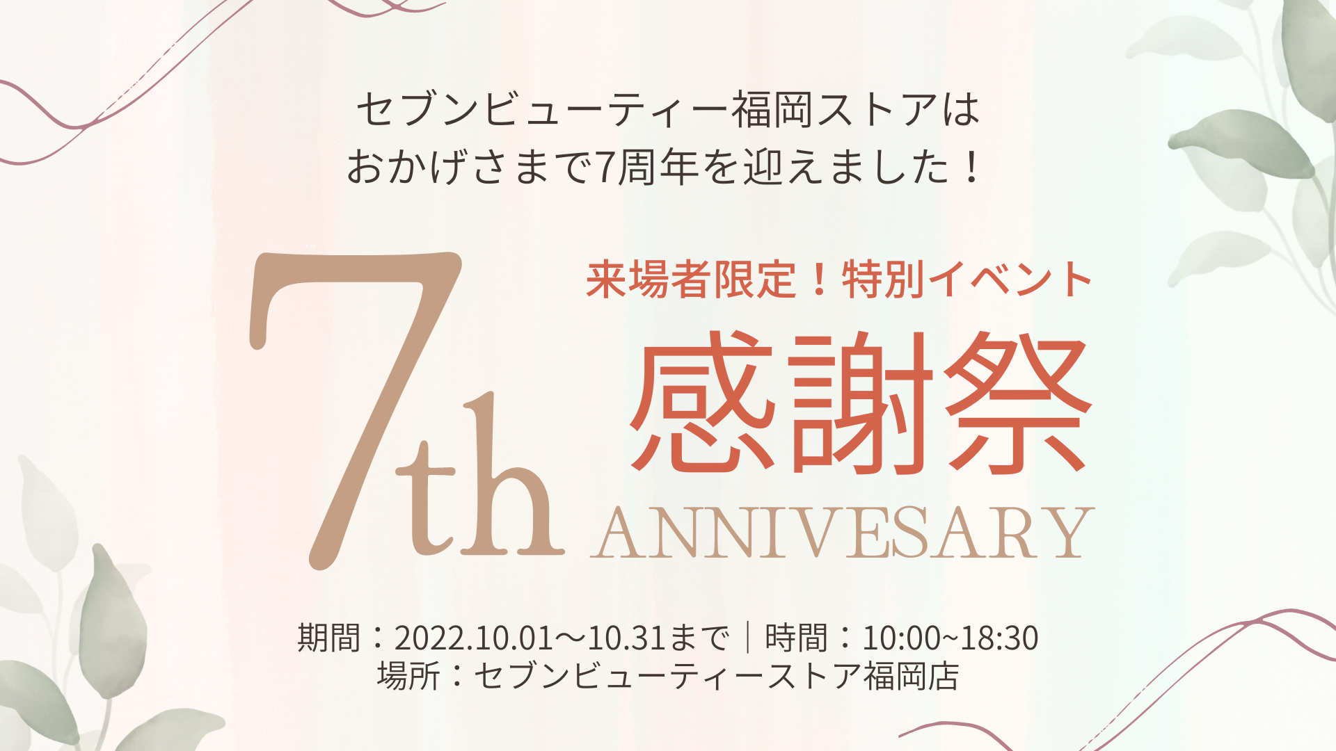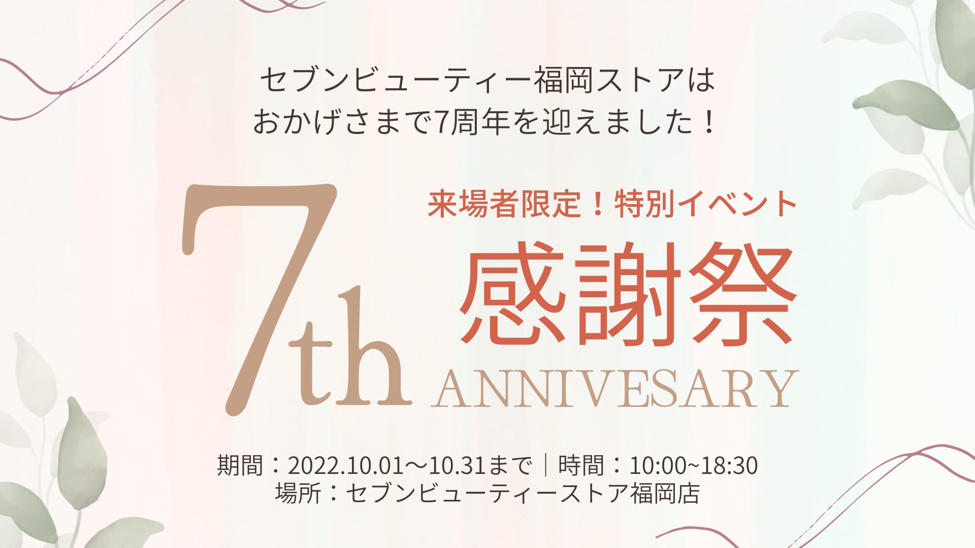 セブンビューティー福岡ストアはおかげさまで7周年を迎えました。記念として来場特典をご用意した感謝祭を開催いたします。
