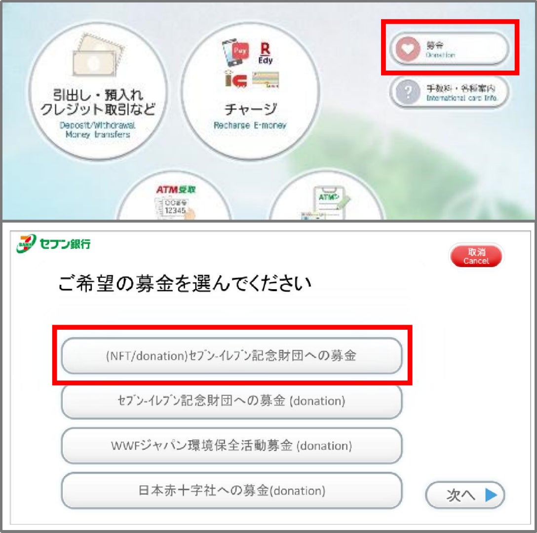 本キャンペーンは、期間中にセブン&アイグループ各店舗をはじめ商業施設、空港や駅等に設置している全国 26,000台以上のセブン銀行ATMにて、一般財団法人 セブン‐イレブン記念財団へATMで募金取引(NFTと記載があるもの)をされた方全員を対象に実施します。
