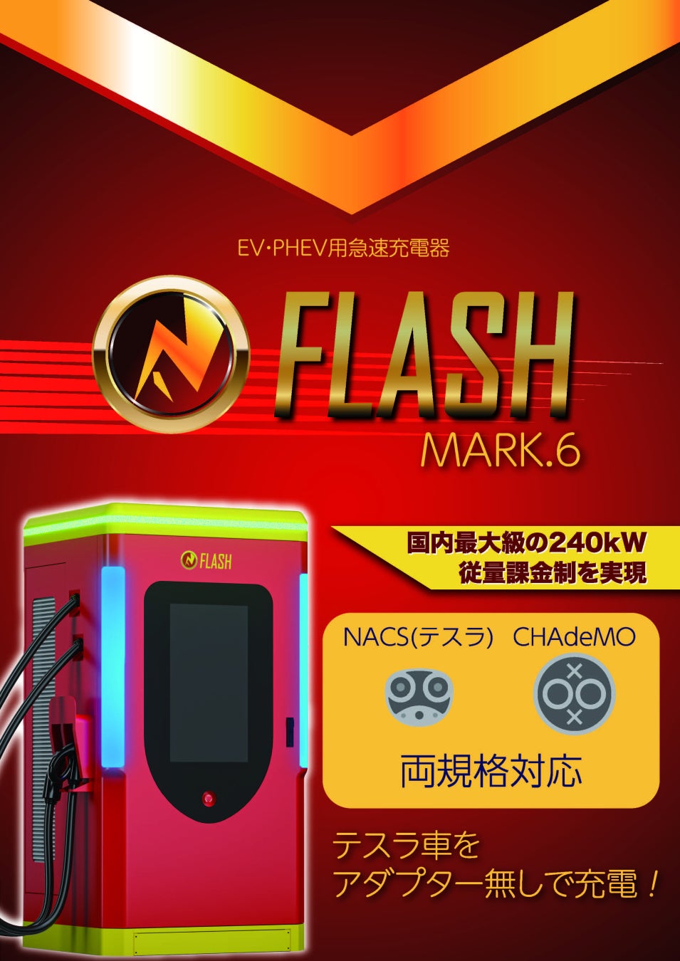 超急速EV充電器「FLASH」(HP:https://ev-charger.jp/)は、従来の時間課金制度に疑問を持ち、革新的な充電量で課金が行われる方法(従量課金制)を採用しました。これにより充電器オーナーと、EVユーザー両方にメリットがある形を実現しつつ、国内最速級の充電速度により、今後発展していくであろうEV業界にフィットするEV充電器です。決済方法も会員登録を必要とせず、クレジットカード/QRコード決済が利用可能で、従来のガソリンスタンドなどと同じような使用感でEV充電器を利用することが可能です。
