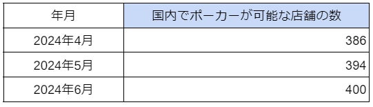 出典元:【2024年6月度】国内「アミューズメントポーカー(ポーカールーム)」の最新店舗数を発表-2024年6月は400件