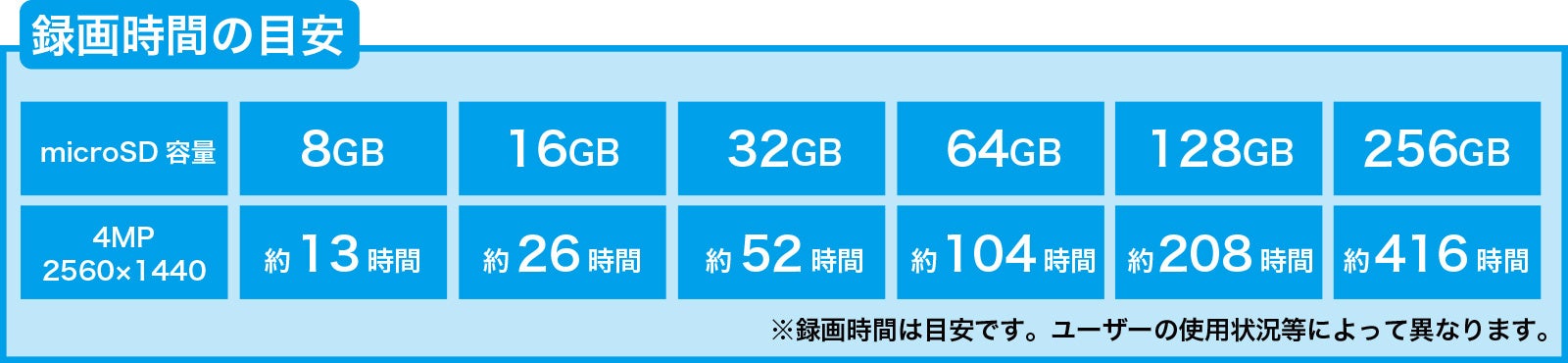 ※microSDカードは別売りとなります。SDカードの容量が一杯になると、古いデータから順に自動削除されます。