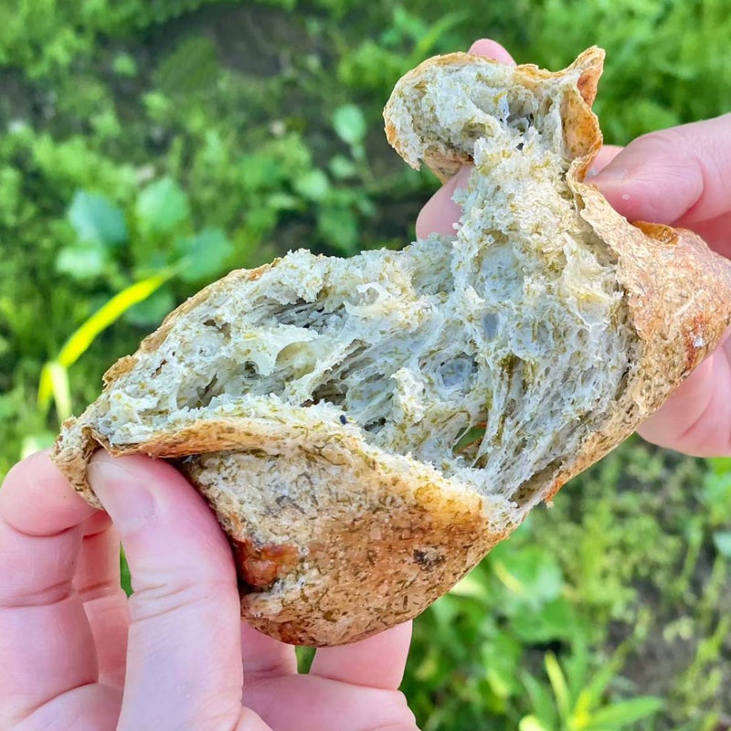 岩手県陸前高田市 発酵パークCAMOCY内にあるパンの名店「ベーカリー MAaLo」の、スジアオノリとモッツァレラチーズが入ったパンです。バターを乗せてトーストにしたり、サンドイッチにしても美味しくいただけます。
