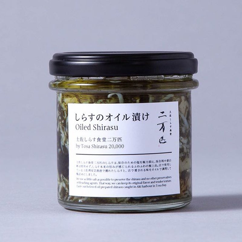 土佐しらす食堂二万匹の自慢の高知県産しらすを、海の香りがギュッと詰まった香り高い「すじ青のり」をオイル漬けにしました。一緒に合わせたジャガイモのコンフィと白胡麻油で旨味もたっぷりです。賞味期限〈20日間(常温)〉