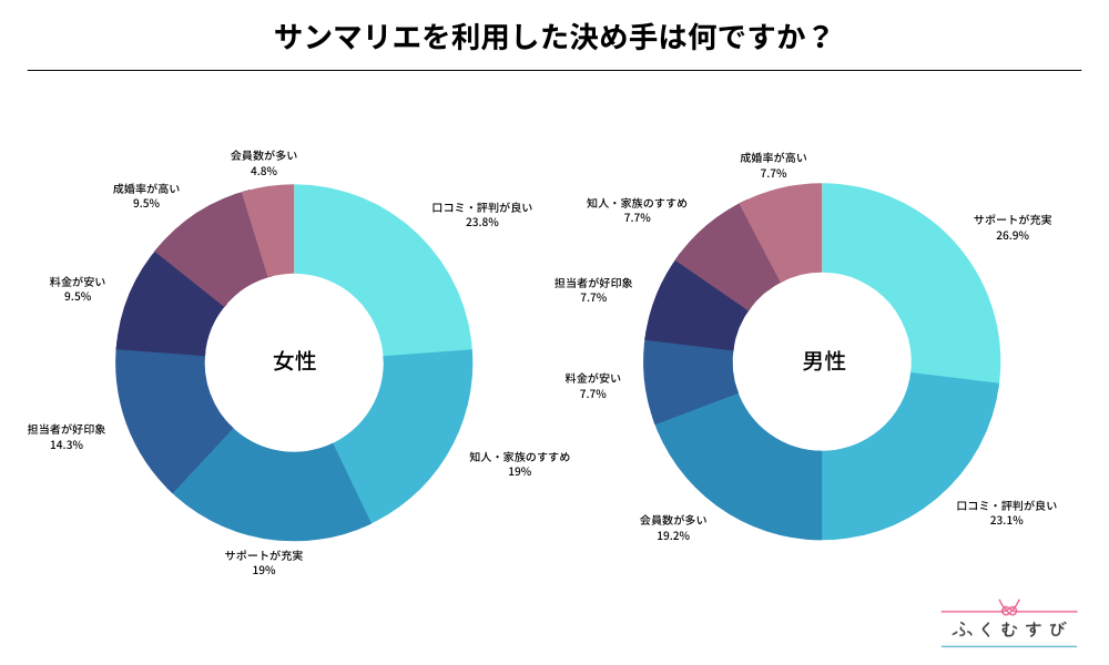 ・男性がサンマリエを利用した決め手は、サポートが充実が1位、口コミ・評判が良いが2位となりました。