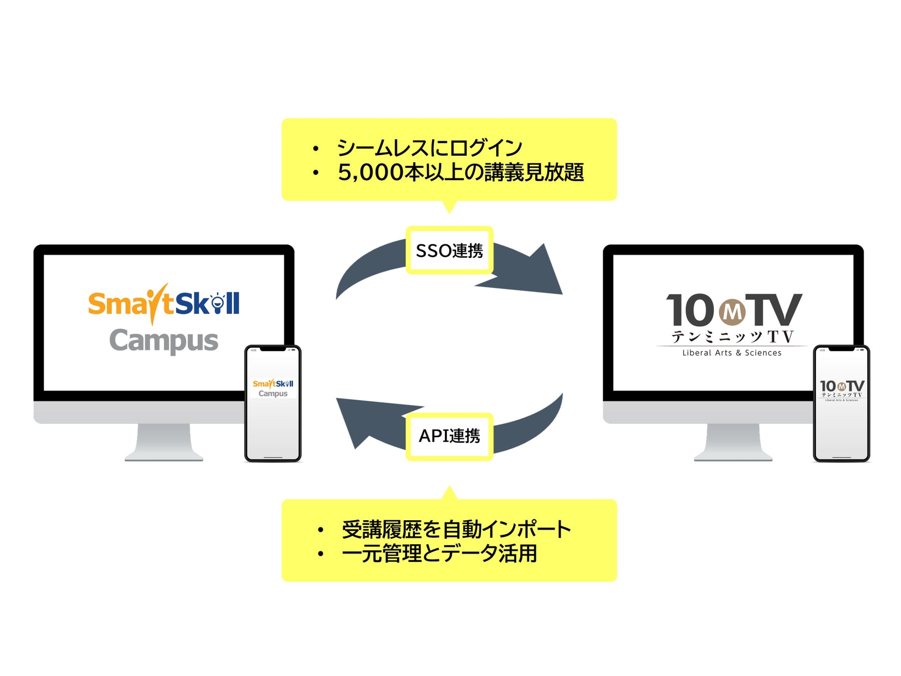 SmartSkill CampusとテンミニッツTVは、SSO(シングルサインオン)連携及びAPI連携いたしました。この連携により以下のメリットを実現します。