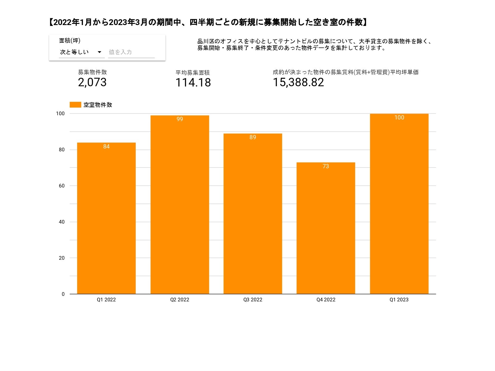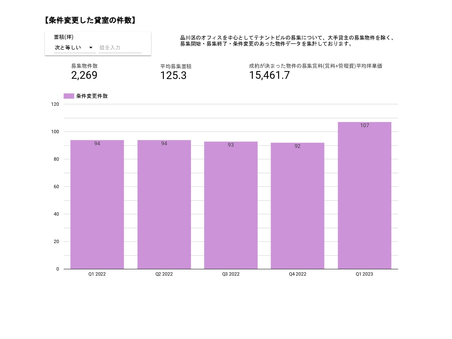 募集開始している空き室面積は、空き室件数に対しておおむね比例しており、バランスの取れた市場環境としては堅調です。空き室数の減少に従い成約面積(競合物件)も減少、条件の向上が見て取れます。この傾向はしばらく継続することが予想されます。
