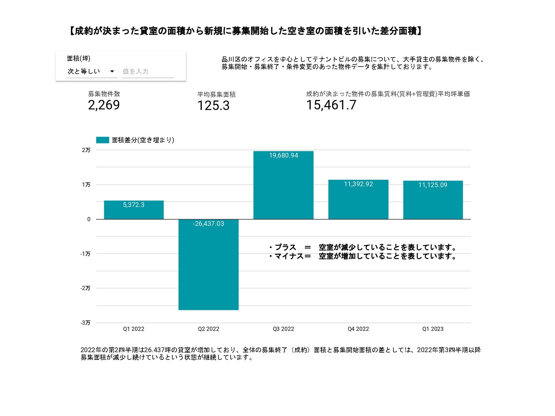 下のグラフは、成約が決まった貸室の面積と新規に募集開始した空き室面積の差分面積を表現しています。品川区に関しては、2022年第2四半期は空室面積が上回っていました。その他期間は成約物件面積が空き室面積を上回っていることから、市場全体として空き室の面積が減少していることがうかがえます。