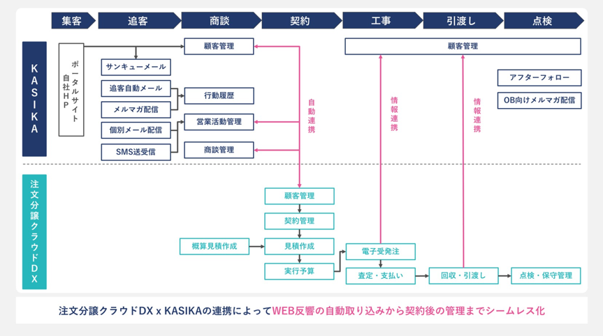 一方、「KASIKA」は、工務店・ハウスメーカー、不動産仲介会社、マンションデベロッパーを中心に1,000社以上に支持される国内最大級の住宅・不動産業界向け自動追客・商談管理ツールです。双方で保有している顧客情報、商談情報、契約情報をAPI連携することで、業務プロセスの大幅な効率化と時間、コストの削減が実現されます。