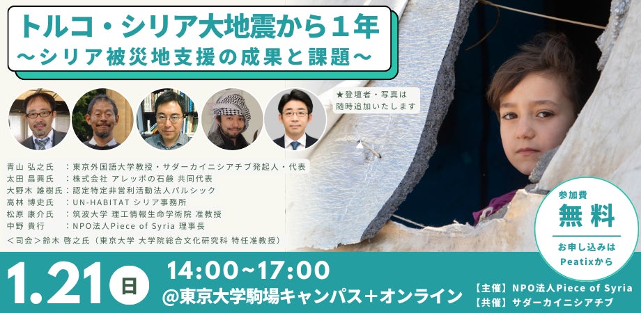 「シリアをまた行きたい国にする」ことを目指し、2016年から活動する大阪生まれのシリア支援団体「NPO法人Piece of Syria(大阪府 代表理事 中野貴行 以下、Piece of Syria)は、シリアの地震支援活動をしてきた団体と有識者を招き、サダーカイニシアチブと共催でのイベントを実施します。