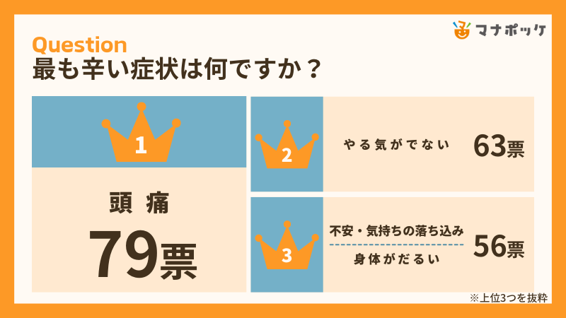 ① 最も辛い症状は「頭痛」「やる気がでない」「不安・気持ちの落ち込み」「身体がだるい」