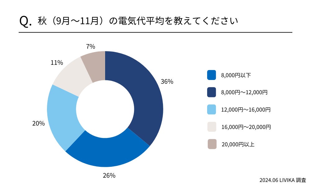 秋も春と同様に、電気代が8,000円~12,000円の範囲内であり、僅差で8,000円以下の家庭も多い結果となりました。建物の大きさや在宅時間によって差が生じますが、秋に20,000円以上の電気代がかかっているご家庭は節約できる可能性がありそうです。