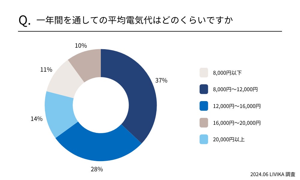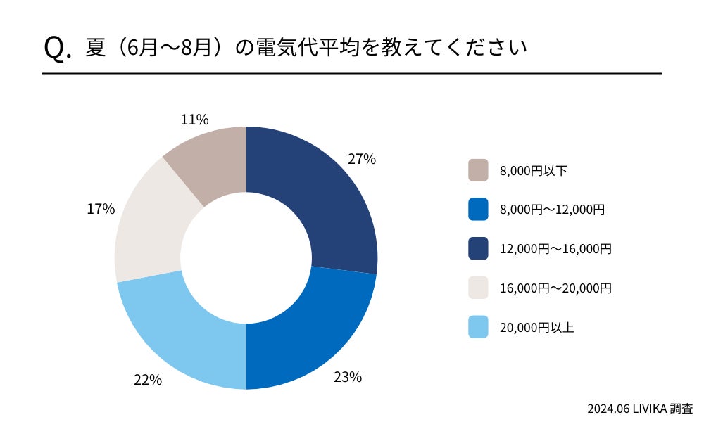 春に比べて、夏場はクーラーなどの使用が増えることで電気代も上昇する傾向にあります。電気代の相場は12,000円〜16,000円が最も多くの回答を集めました。