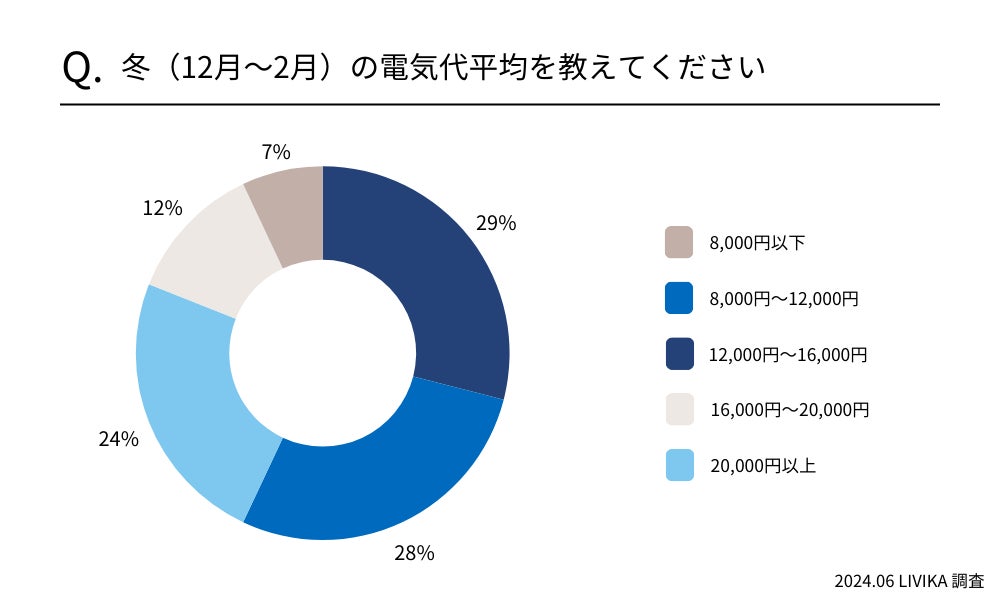 冬については、夏と同様に12,000円~16,000円と回答した方が最も多い結果となりました。ただし、夏に比べて8,000円~12,000円と回答した人が増加しています。冷房器具は夏には不可欠ですが、冬の防寒対策では、厚着などをすることで対策する人も多いのかもしれません。