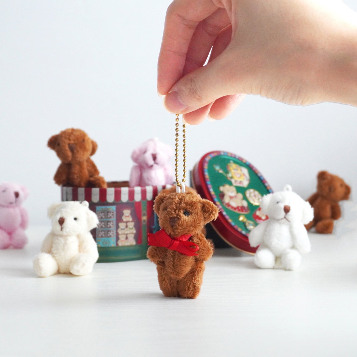 小さなクマのぬいぐるみはリボンをつけたり、チェーンをつけてアレンジして持ち歩くことができます。
