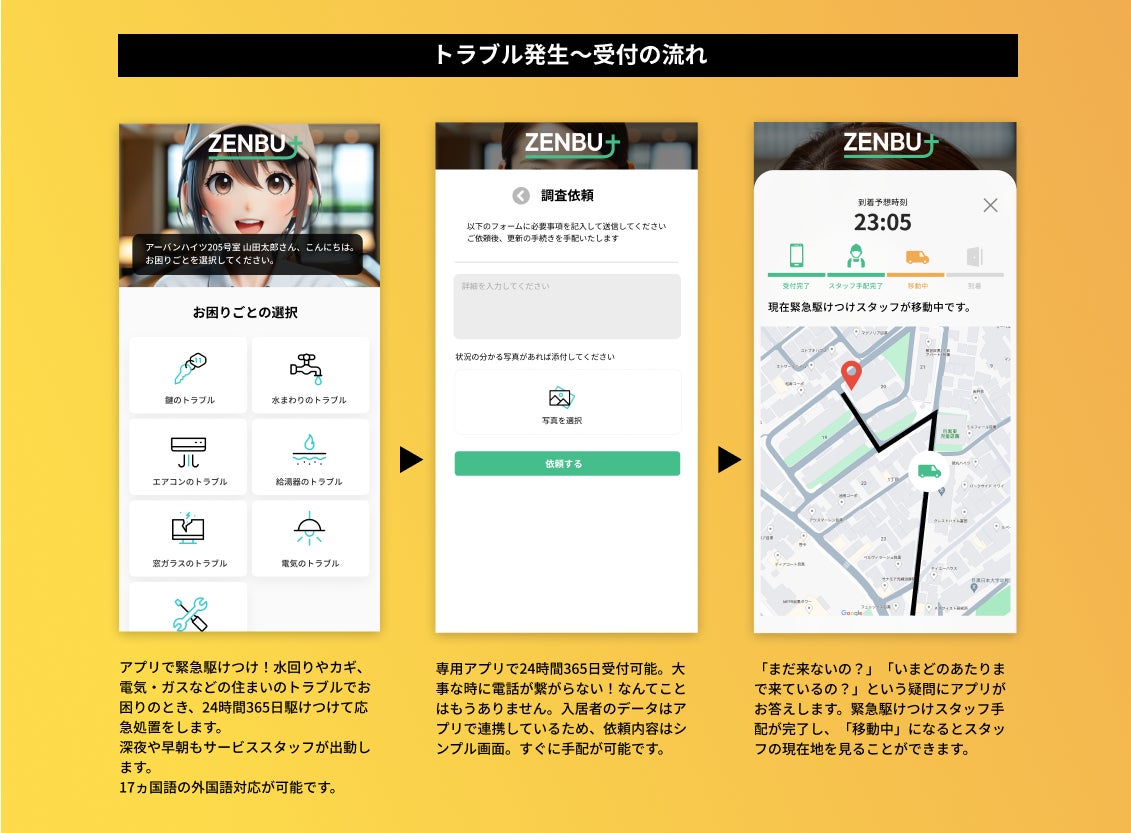 全国の専有部および共用部のトラブルに駆けつける緊急駆けつけサービス『ZENBU+』を通し、アナログでバラバラになっていた従来の緊急駆けつけ業務をデジタルで繋ぐとともに、利用者にはアプリを用いたリアルタイムでの状況確認を可能にすることで、新しい体験価値を提供してまいります。