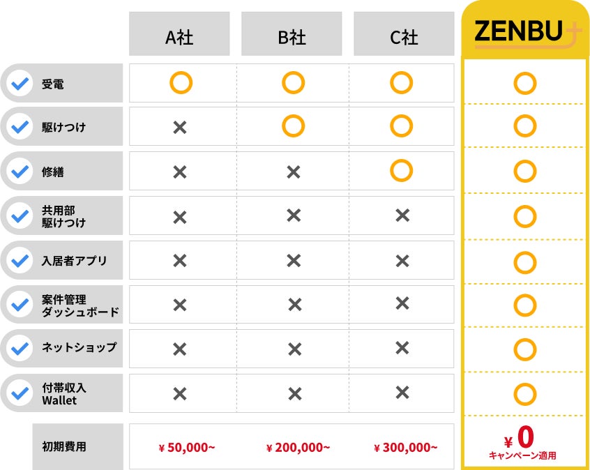 ZENBU PLUSでは、建物の専有部および共用部のトラブルに駆けつける緊急駆けつけサービス『ZENBU+』を24時間365日全国展開してまいります。