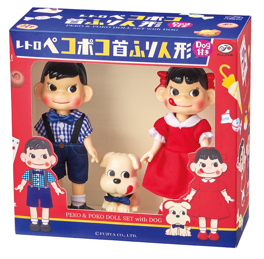 首がゆらゆら揺れる首ふり人形のセット。昔懐かしいレトロな雰囲気が漂う首ふり人形は、ご自宅のどこに飾ってもインパクト抜群です。ペコちゃんは真っ赤なワンピース、ポコちゃんはギンガムチェックの青いシャツ、ドッグは蝶ネクタイを付け、みんな揃っておめかしした、可愛らしいデザインです。(※ドッグの首は揺れません。)