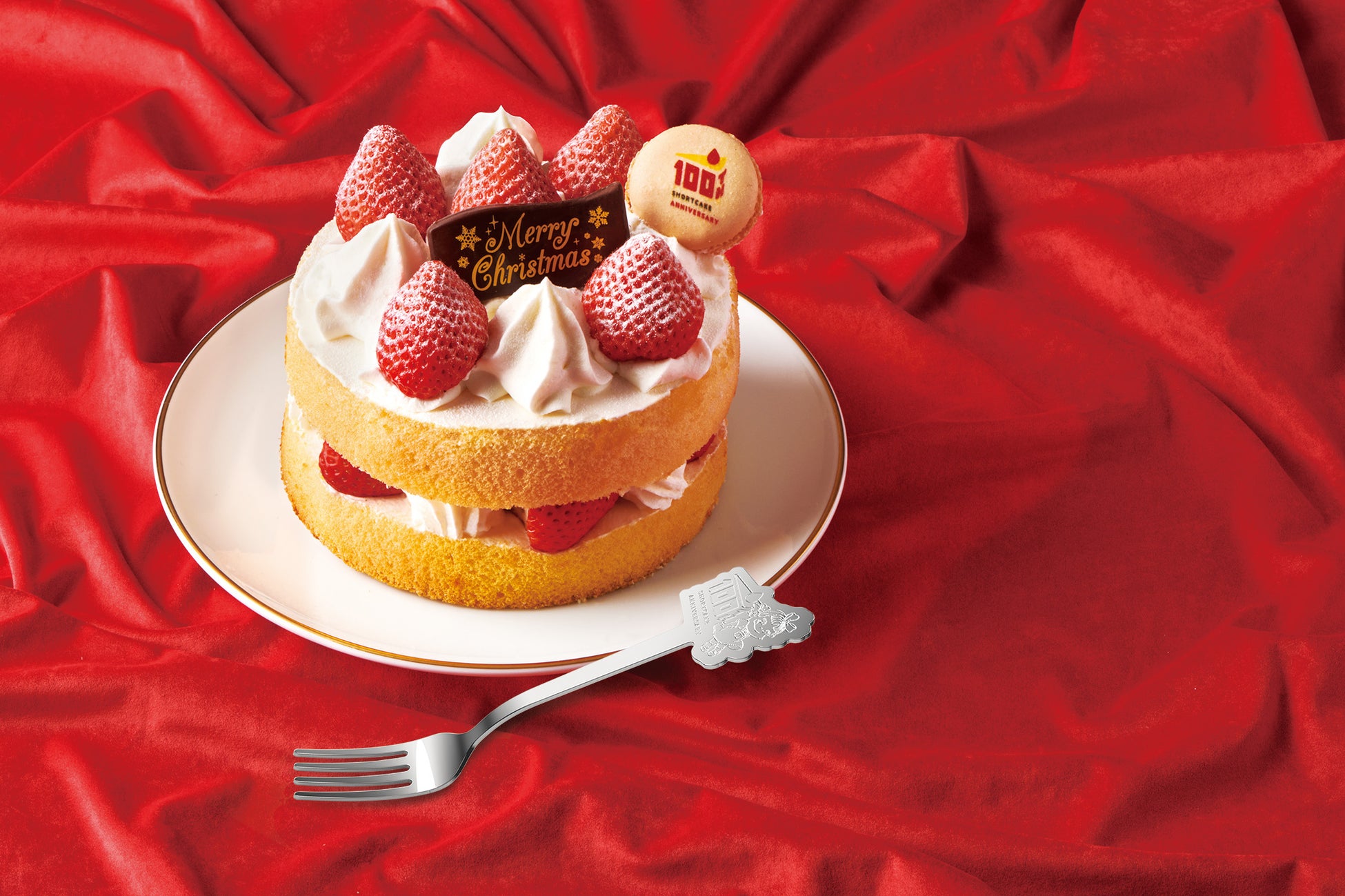 国産小麦にこだわったスポンジに、プレミアムシャンテリークリームと国産苺をまるごと6粒サンドし、上面には国産苺を5粒飾りました。別添のショートケーキ100周年ロゴ入りマカロン皮や、限定デザインのオリジナルフォークと一緒にお楽しみいただけます。