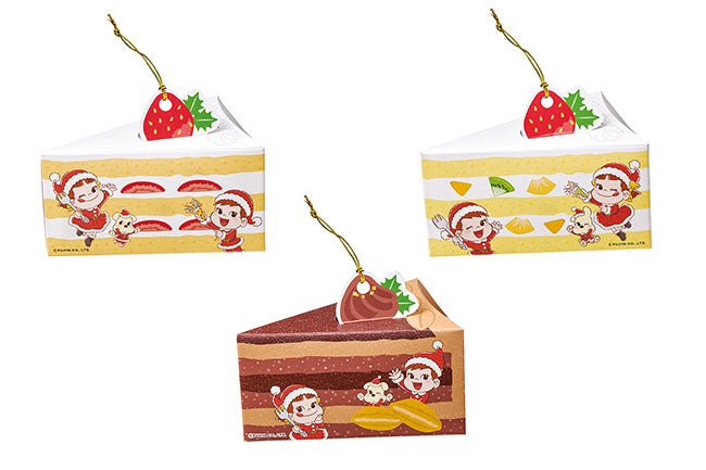 不二家洋菓子店らしい、カットケーキ型のクリスマスオーナメント。サンタさんに扮したペコちゃんやポコちゃんも描かれた、クリスマス仕様のデザインです。中にはお菓子やシールが入っています。お菓子を食べ終わった後にも、ツリーなどに飾って楽しめて、ちょっとしたプレゼントにもぴったりです。