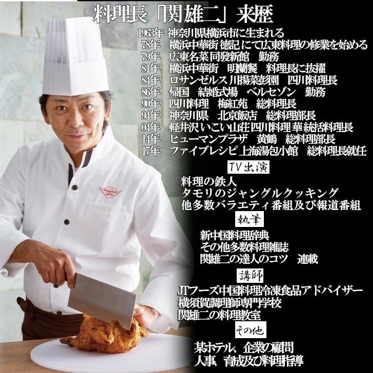 小籠湯包をはじめとする、一流ホテルや名店で中華を極め、過去にはテレビ番組「料理の鉄人」にも出演した料理長「関 雄二」が監修。