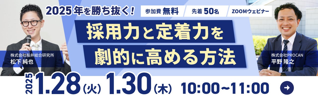 「プロキャス警備」などシステム開発事業を行う株式会社PROCAN(本社:東京都中央区、代表取締役:若村和明)は、株式会社船井総合研究所(本社:大阪府大阪市、代表取締役社長:真貝大介)と、2025年1月28日(火)と1月30日(木)にオンラインにて警備業界の「採用力と定着力を劇的に高める方法」をテーマにウェビナーを開催します。両日とも内容は同様で、優秀な人材の採用や定着にお悩みの警備会社様に向け、最新の業界動向に基づいた効果的な人材採用と定着戦略をご紹介いたします。