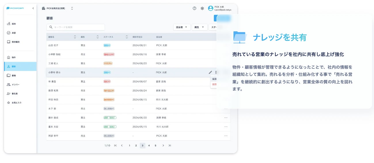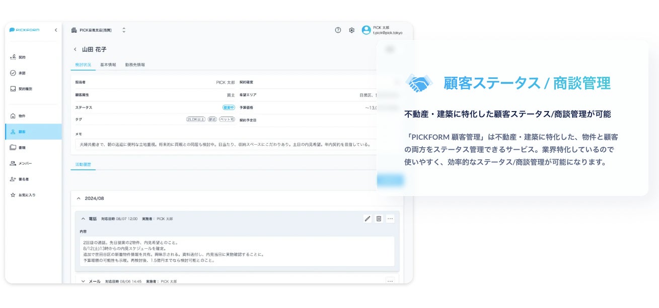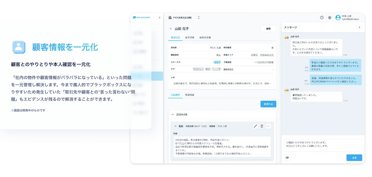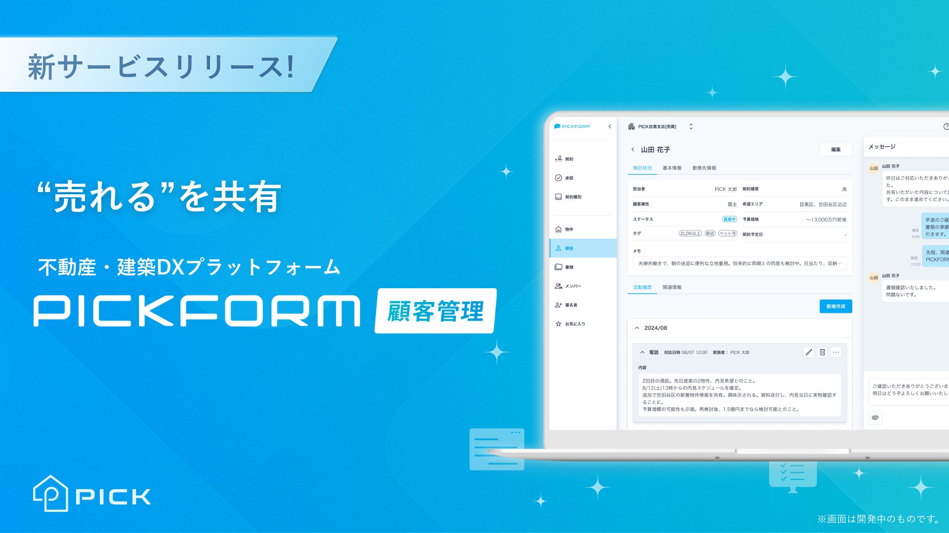 「不動産取引を快適に、オープンに」をミッションに掲げる株式会社PICK(本社:東京都目黒区、代表取締役社長兼CEO:普家 辰哉、以下:PICK)は、「PICKFORM 電子契約」「PICKFORM 案件管理」に続く、PICKFORMシリーズ第三弾として「PICKFORM 顧客管理」のサービス提供を開始します。